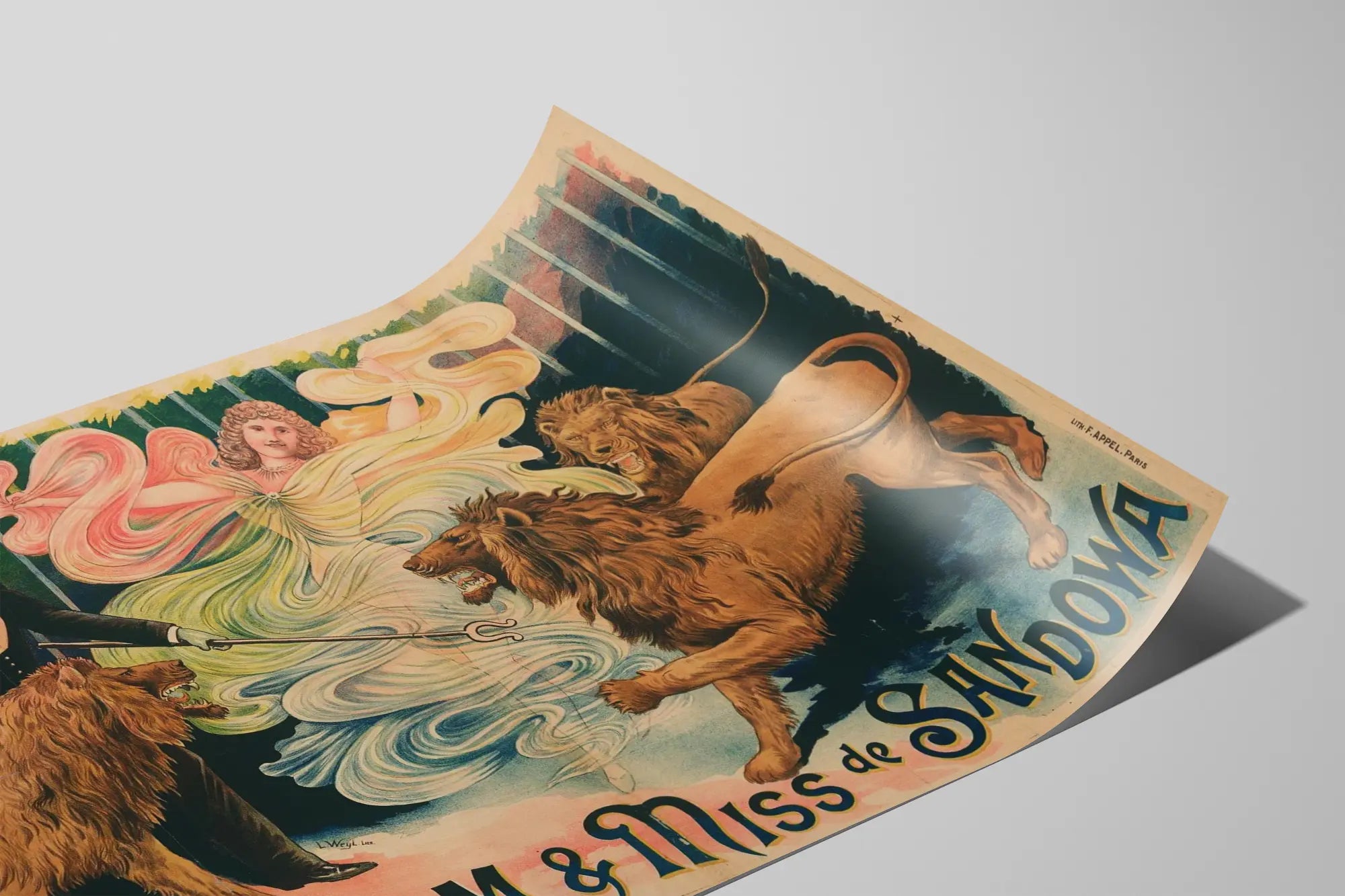 Cette affiche vintage intitulée "Max-Himm & Miss de Sandowa" présente une scène spectaculaire de domptage de lions. L'image met en scène un dompteur élégant, vêtu d'un costume noir et d'un gilet blanc, tenant une canne et maîtrisant trois lions rugissants dans leur cage. À ses côtés, une femme gracieuse, semblant presque éthérée, danse avec des bandelettes colorées flottant autour d'elle, apportant une touche de légèreté et de mystère à cette scène puissante. Les lions, magnifiquement illustrés avec leurs crinières détaillées, ajoutent une intensité dramatique à cette œuvre. L'affiche est signée par Paul de Senanc et lithographiée par F. Appel à Paris, renforçant son authenticité et son charme rétro. Ce poster décoratif est idéal pour les amateurs d'art vintage et de décoration murale originale, permettant d'ajouter un accent fort et élégant à tout intérieur. Sa palette de couleurs mêlant tons chauds et froids ainsi que ses traits artistiques font de cette affiche un véritable objet déco chargé d'histoire et d'émotion. Parfaite pour être encadrée, cette décoration murale captivante saura attirer le regard et enrichir l'ambiance d'un salon, bureau ou espace culturel.