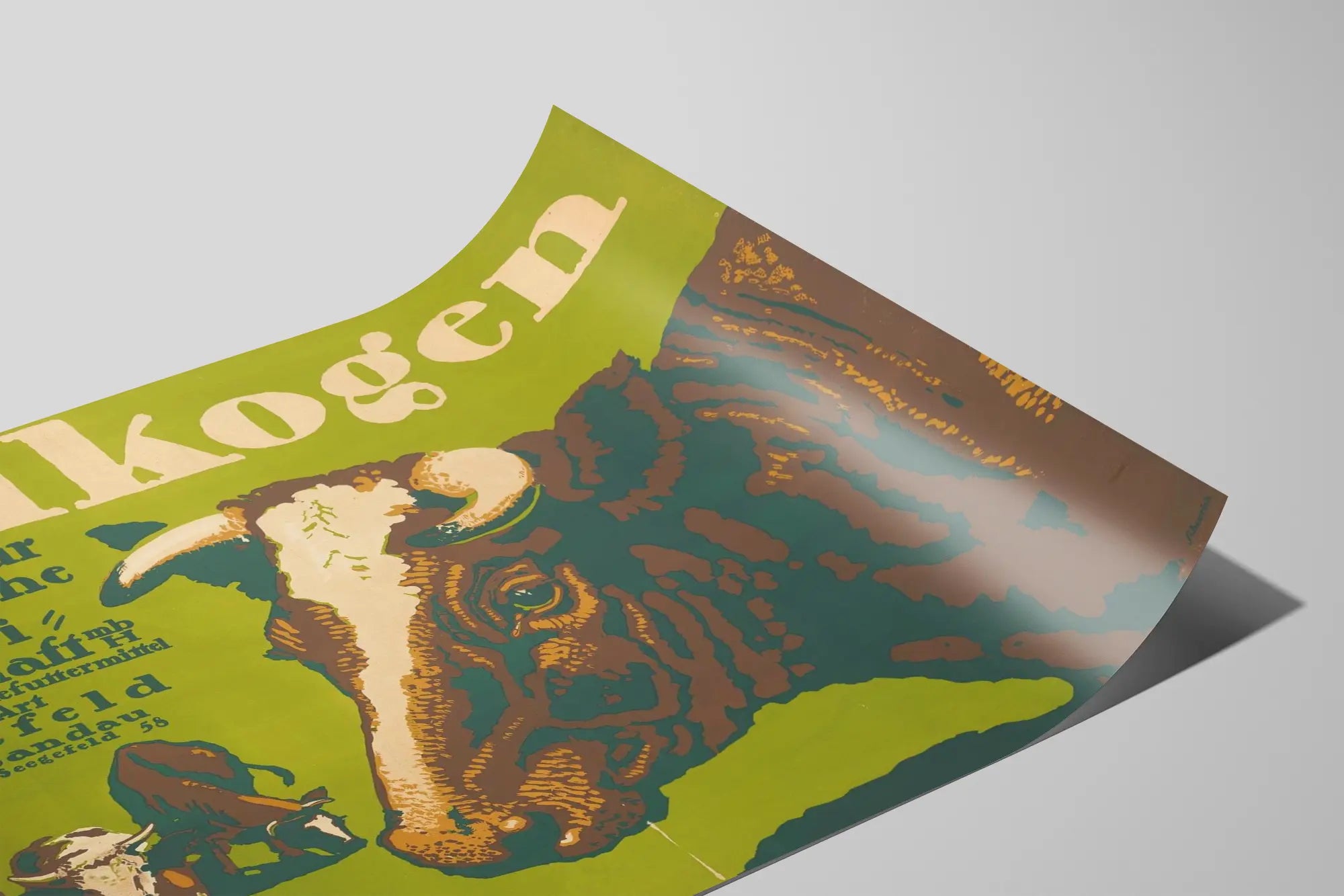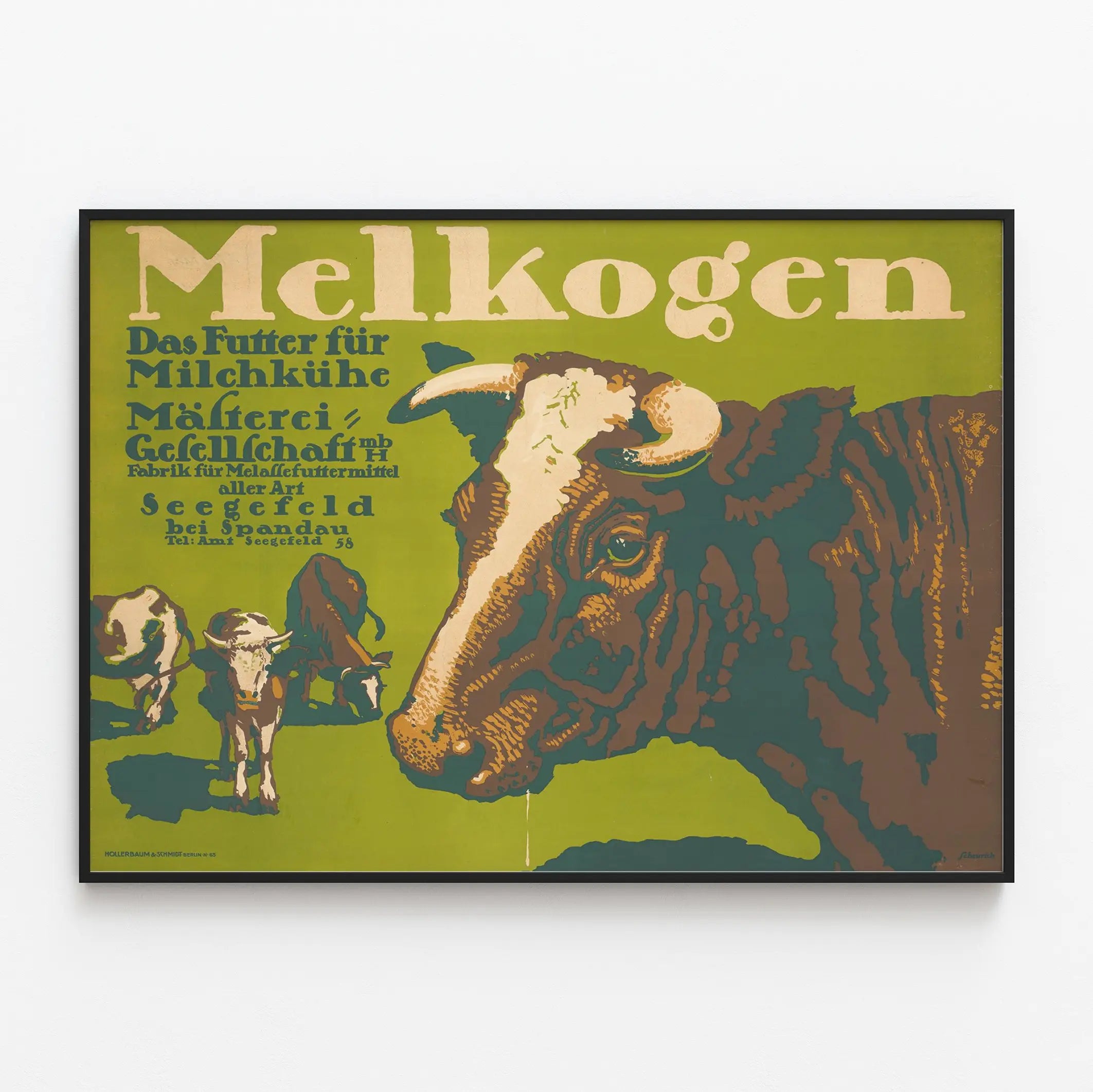 Le texte en allemand, présent sur l'affiche, indique que Melkogen est une marque dédiée à « l'alimentation pour vaches laitières », soulignant l'aspect fonctionnel et utilitaire initial de cette affiche. Cette œuvre évoque un univers agricole authentique et s'inscrit parfaitement dans une décoration murale thématique ou vintage.