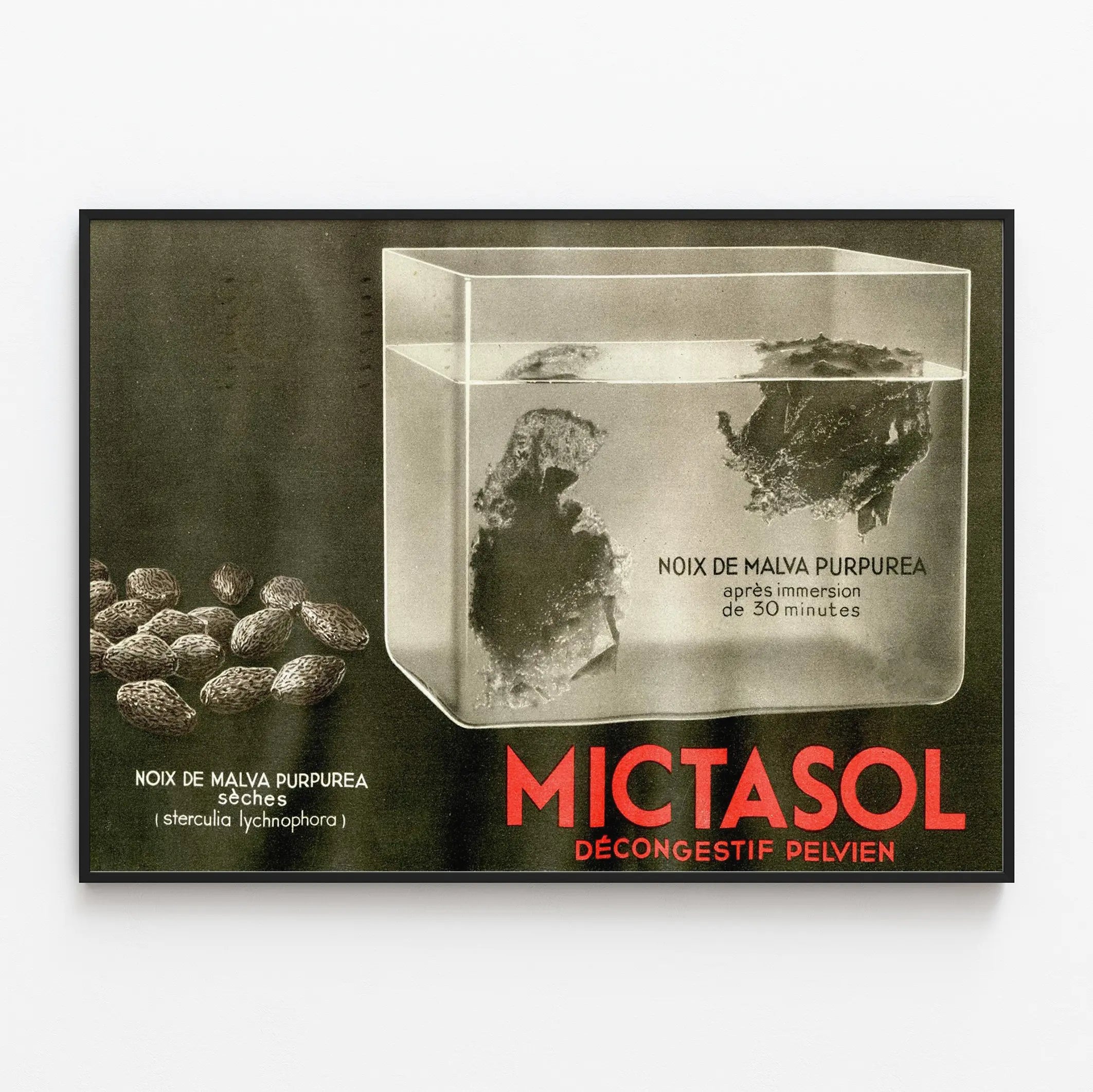 Cette affiche vintage intitulée "Mictasol" illustre une découverte scientifique avec un style rétro unique. Elle présente une image en noir et blanc d'une expérience d'immersion de noix de malva purpurea, aussi appelée Sterculia lychnophora, dans un liquide pendant 30 minutes. Le visuel oppose la représentation des noix sèches sur fond sombre à celles immergées dans un récipient transparent rempli de liquide, mettant en avant un concept médical lié au décongestionnement pelvien. Cette décoration murale offre une ambiance originale et authentique, parfaite pour les amateurs d'art graphique rétro ou d'imagerie scientifique historique. En tant qu'affiche déco, elle conjugue esthétique et thématique médicale, apportant une touche d'éducation et de curiosité à votre intérieur. Ce poster s'avère idéal pour une décoration murale singulière dans un bureau, salle d'attente, ou salon, notamment pour ceux qui recherchent un tableau avec une atmosphère scientifique et vintage. Grâce à son graphisme sobre et contrasté, ce visuel s'adapte aussi bien à un cadre moderne qu'à un intérieur au style industriel ou minimaliste. L'affiche Mictasol constitue un choix original pour enrichir un mur avec une œuvre décorative qui interpelle et invite à la réflexion sur la science et la nature. En somme, ce poster vintage mêle connaissances botaniques et ambiance esthétique pour faire de votre décoration murale un point d'intérêt inhabituel et élégant.