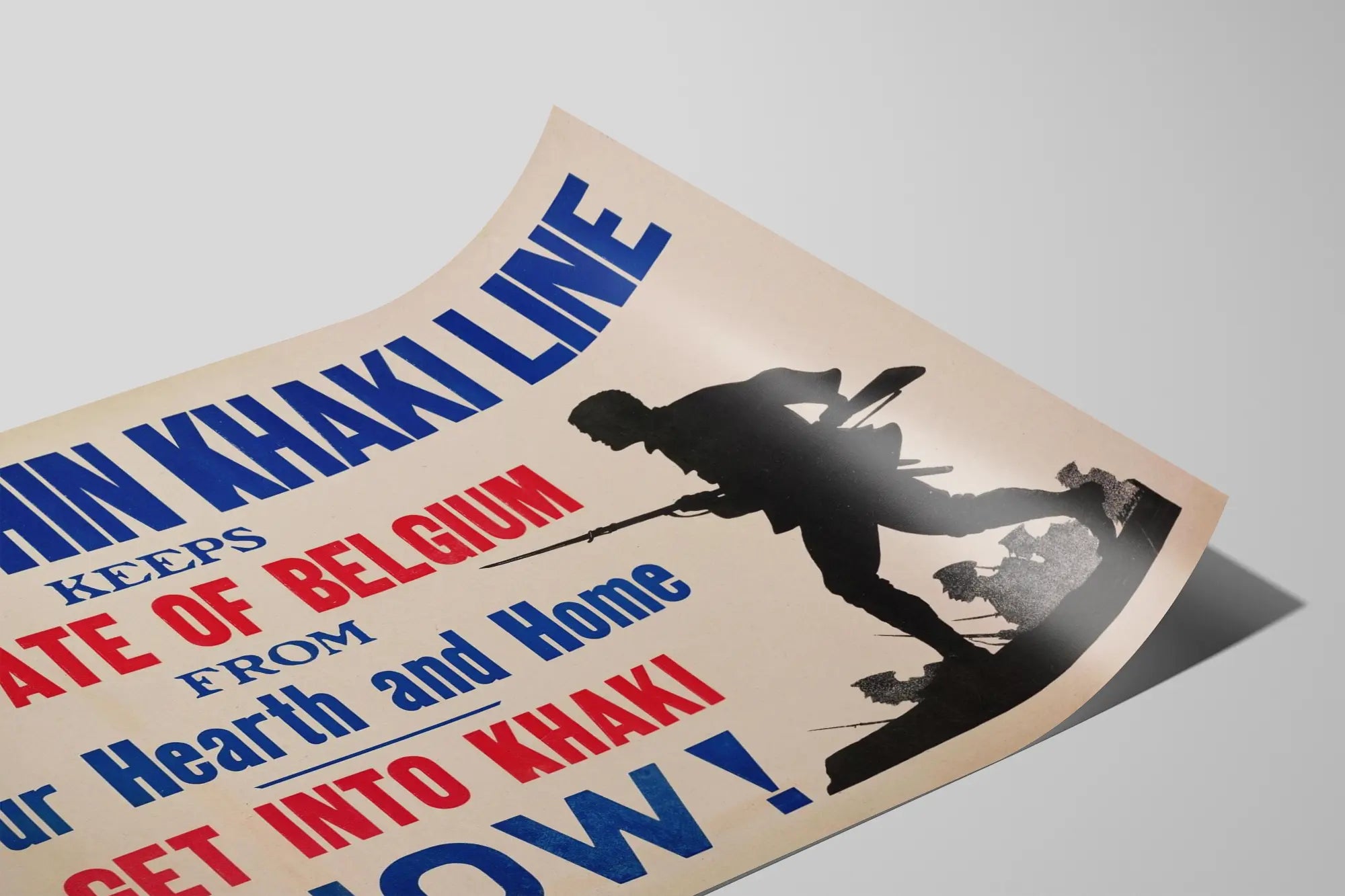 Décorez vos murs avec cette affiche vintage saisissante intitulée "The Thin Khaki Line". Ce poster de style militaire met en avant un message fort incitant au recrutement, avec un texte en lettres majuscules bleues et rouges qui capte immédiatement l'attention. La composition graphique mêle texte et silhouette noire d'un soldat armé, donnant une impression de dynamisme et d'urgence. Cette décoration murale évoque un esprit de courage et de défense, idéal pour un intérieur au style rétro ou historique.