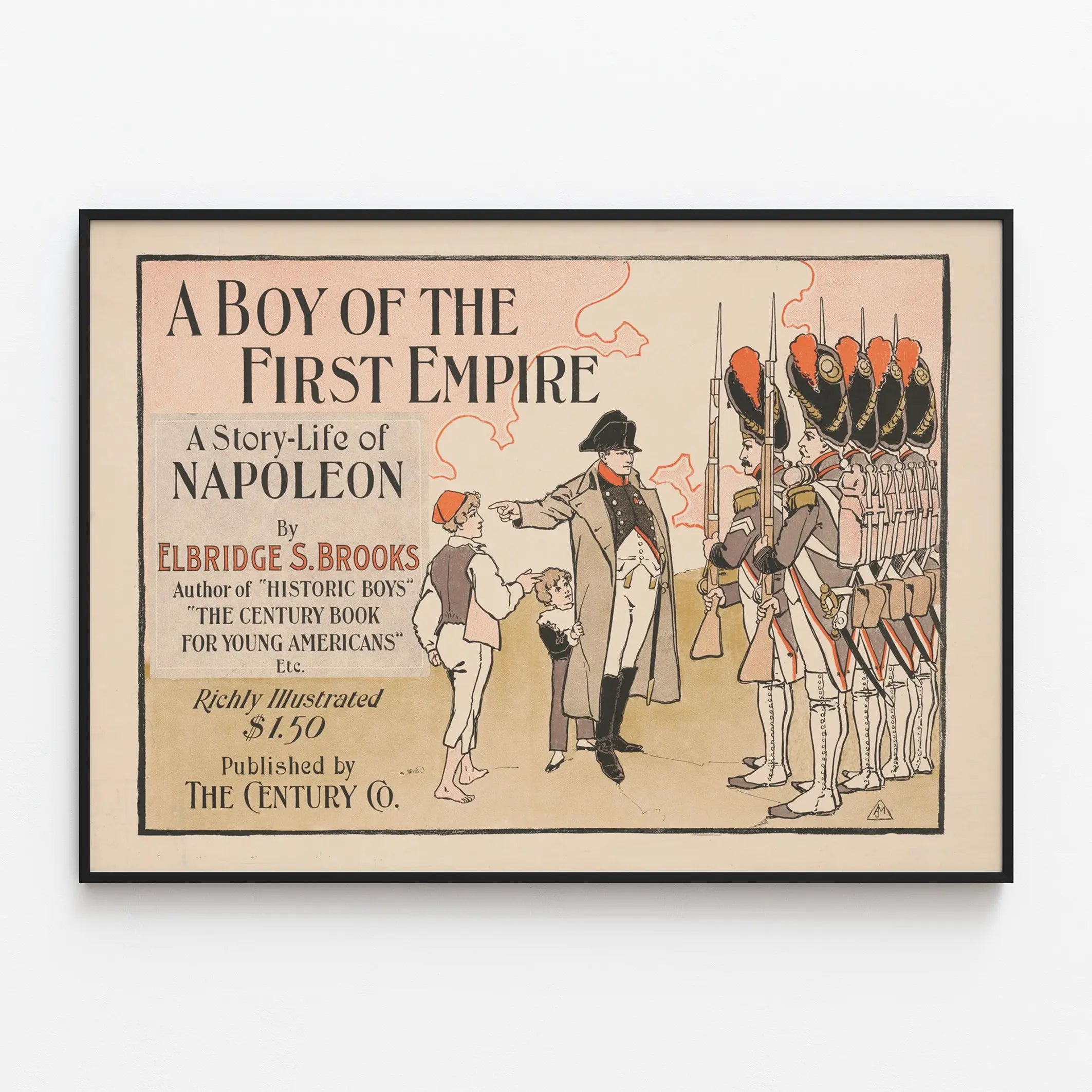Cette affiche vintage, intitulée « A Boy of the First Empire », est une pièce de décoration murale idéale pour les amateurs d'histoire et de Napoléon. Elle illustre la couverture d'un livre racontant la vie de Napoléon, écrit par Elbridge S. Brooks, et se distingue par son style graphique d'époque avec des tons doux de beige, rose et orange. Cette décoration murale présente une scène où Napoléon, dans son habit militaire emblématique, interagit avec des jeunes garçons tandis que des soldats en uniforme de la Première Empire sont alignés en formation. Le design met en valeur les détails des uniformes et des gestes, avec un effet sur la typographie ancienne très esthétique, ce qui en fait un poster parfait pour un intérieur classique ou thématique. Cette affiche imprimée est richement illustrée et évoque l'époque historique du Premier Empire français, ajoutant une touche culturelle et éducative à votre décoration intérieure. Parfait pour une bibliothèque, un bureau ou un salon, ce poster vintage est une invitation à découvrir ou redécouvrir une époque marquante de l'histoire de France avec une approche visuelle élégante et narrative.