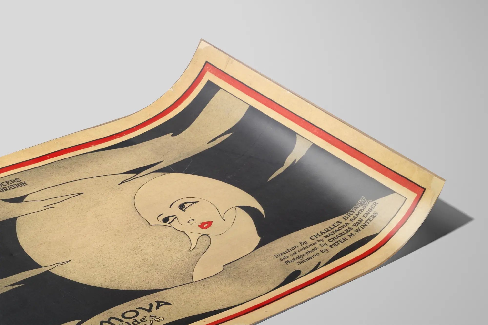 Cette affiche publicitaire pour une production cinématographique ancienne précise la direction de Charles Bryant, la mise en scène et les costumes réalisés par Natacha Rambova, ainsi que la photographie par Charles Van Enger et le scénario de Peter M. Winters. Ces détails enrichissent la dimension artistique et historique du poster, témoignant d'une œuvre majeure du cinéma muet liée à une adaptation théâtrale célèbre.