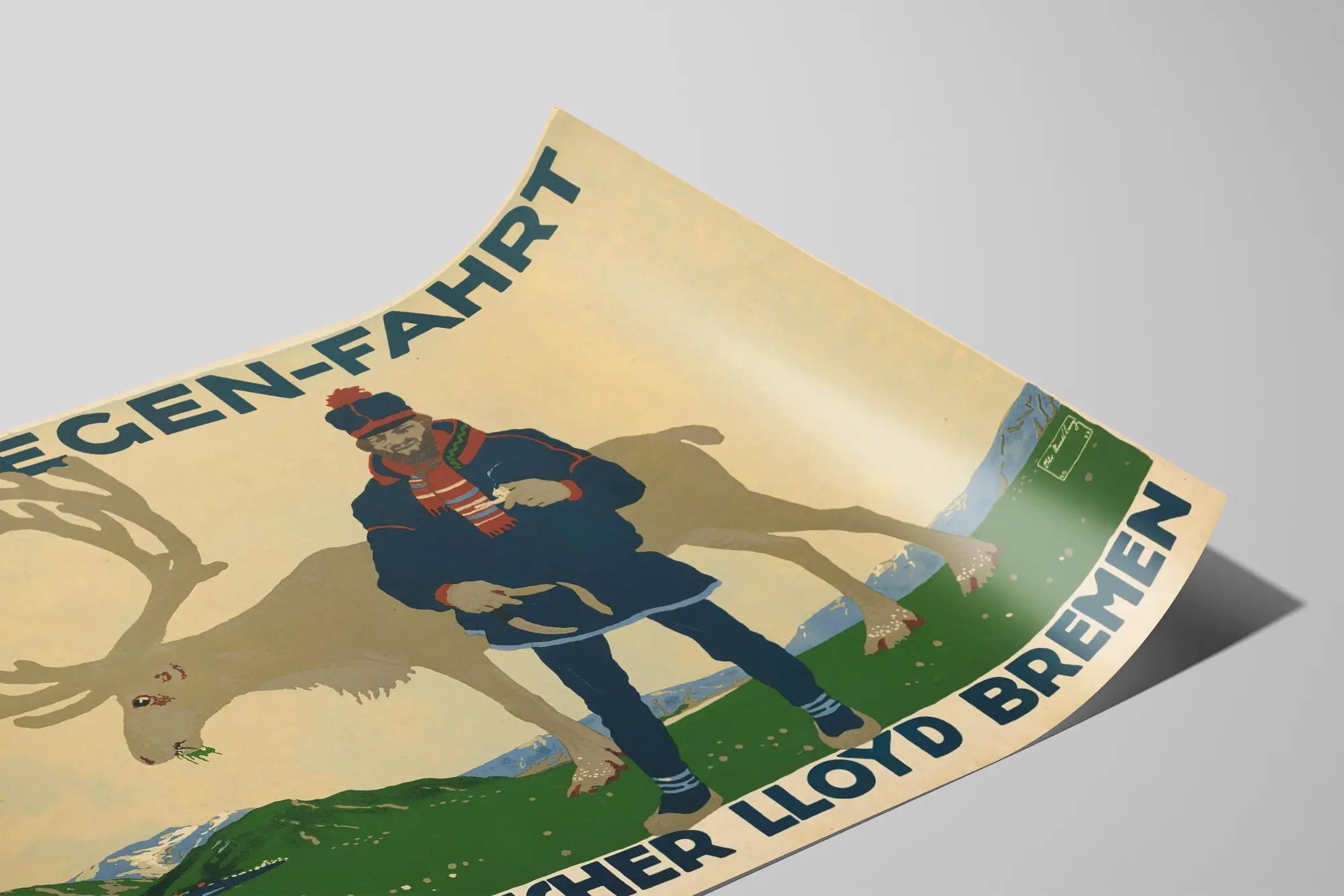Cette affiche vintage intitulée "Norwegen-Fahrt Norddeutscher Lloyd Bremen" est une décoration murale qui invite au voyage vers la Norvège, réalisée dans un style graphique et épuré. On y voit un homme vêtu d'un costume traditionnel nordique, accompagné d'un caribou, sur fond de paysage montagneux avec des sommets enneigés et de la végétation verte. Les couleurs dominantes sont douces et naturelles, utilisant principalement des nuances de bleu, vert, beige et brun. Le texte en haut et en bas de l'affiche annonce la destination « Norwegen-Fahrt » (voyage en Norvège) et la compagnie Norddeutscher Lloyd Bremen, connue pour ses croisières et voyages maritimes. Cette affiche retrace avec authenticité un passé historique lié aux voyages nordiques en mer et peut apporter une touche rétro et culturelle à une pièce. Cette décoration murale se distingue par son design simple mais évocateur, alliant un aspect humain et naturel qui séduira les amateurs de posters vintage et d’art graphique. Elle s’intègre parfaitement dans un intérieur au style industriel, scandinave ou classique, tout en apportant une note d’exotisme et d’aventure maritime. Idéal pour habiller un mur avec une pièce qui combine histoire, culture nordique et design vintage, ce poster est un choix décoratif original et chargé de caractère.