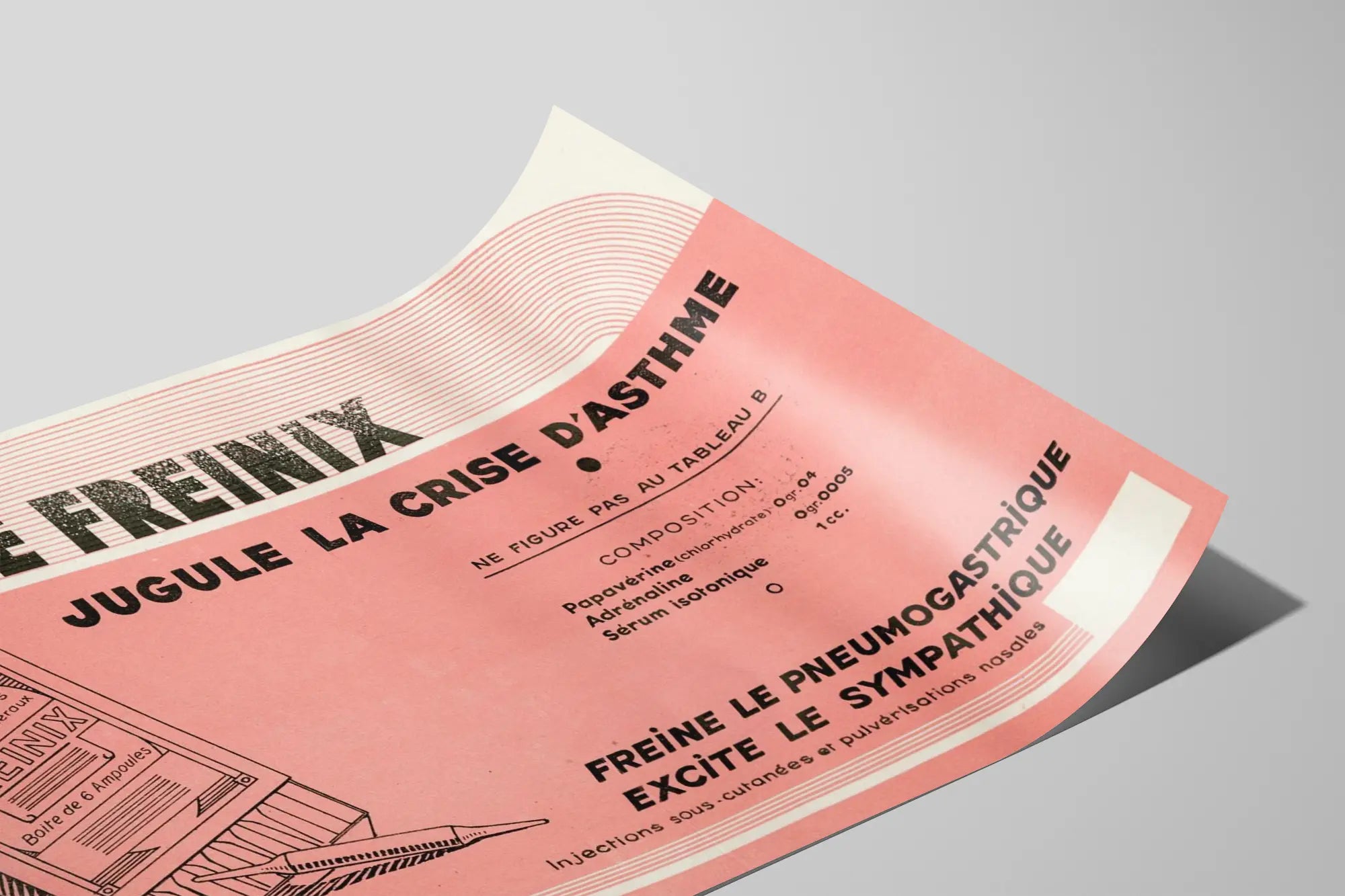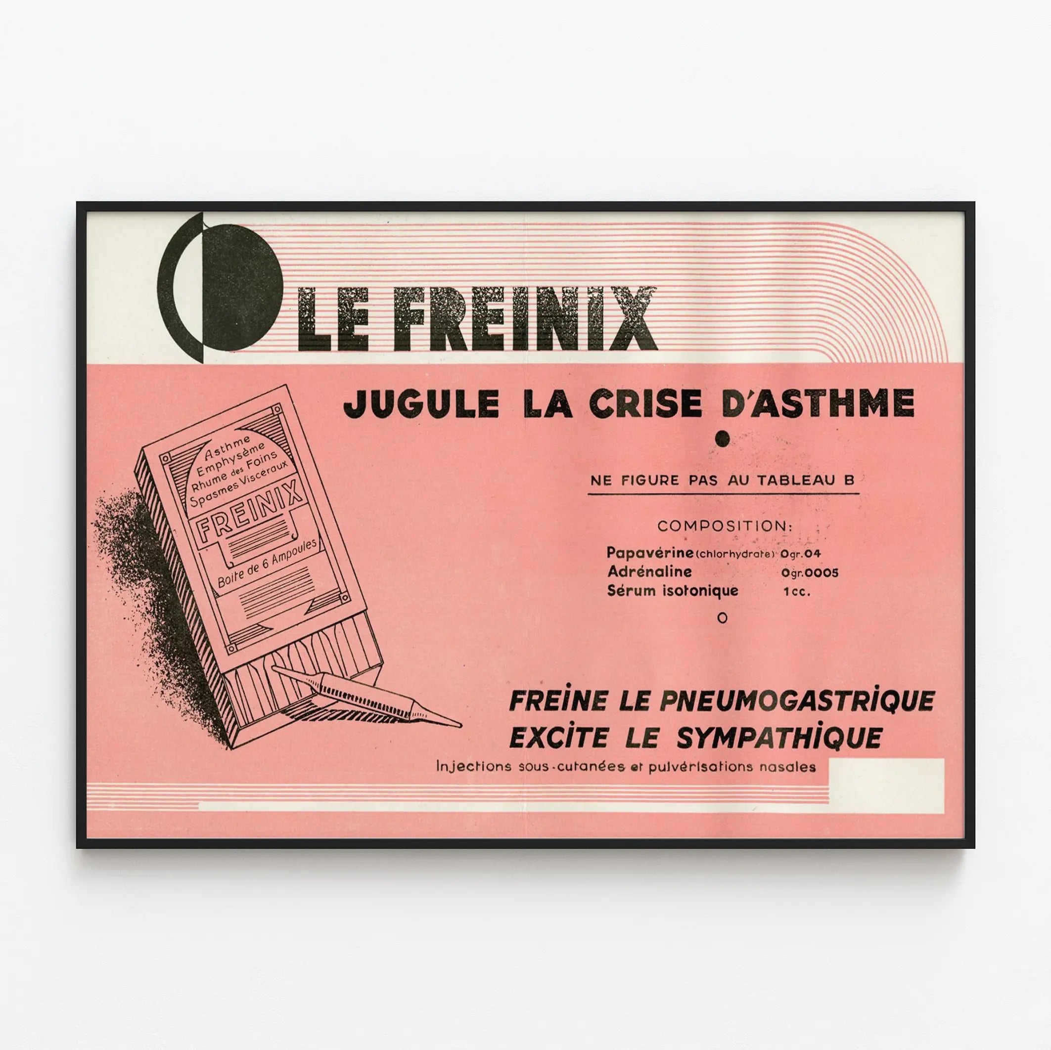 Cette affiche vintage présente Le Freinix, un produit conçu pour juguler la crise d'asthme ainsi que d'autres affections respiratoires telles que l'emphysème, le rhume des foins et les spasmes viscéraux. La composition indiquée comprend de la papavérine (chlorhydrate), de l'adrénaline et du sérum isotonique, détaillant une solution médicamenteuse administrée par injections sous-cutanées et pulvérisations nasales. La mise en page joue sur des contrastes de couleurs pastel avec un fond rose et des éléments graphiques en noir, incluant un dessin d'une boîte de six ampoules Freinix, soulignant un style rétro rappelant la publicité pharmaceutique du milieu du XXe siècle.