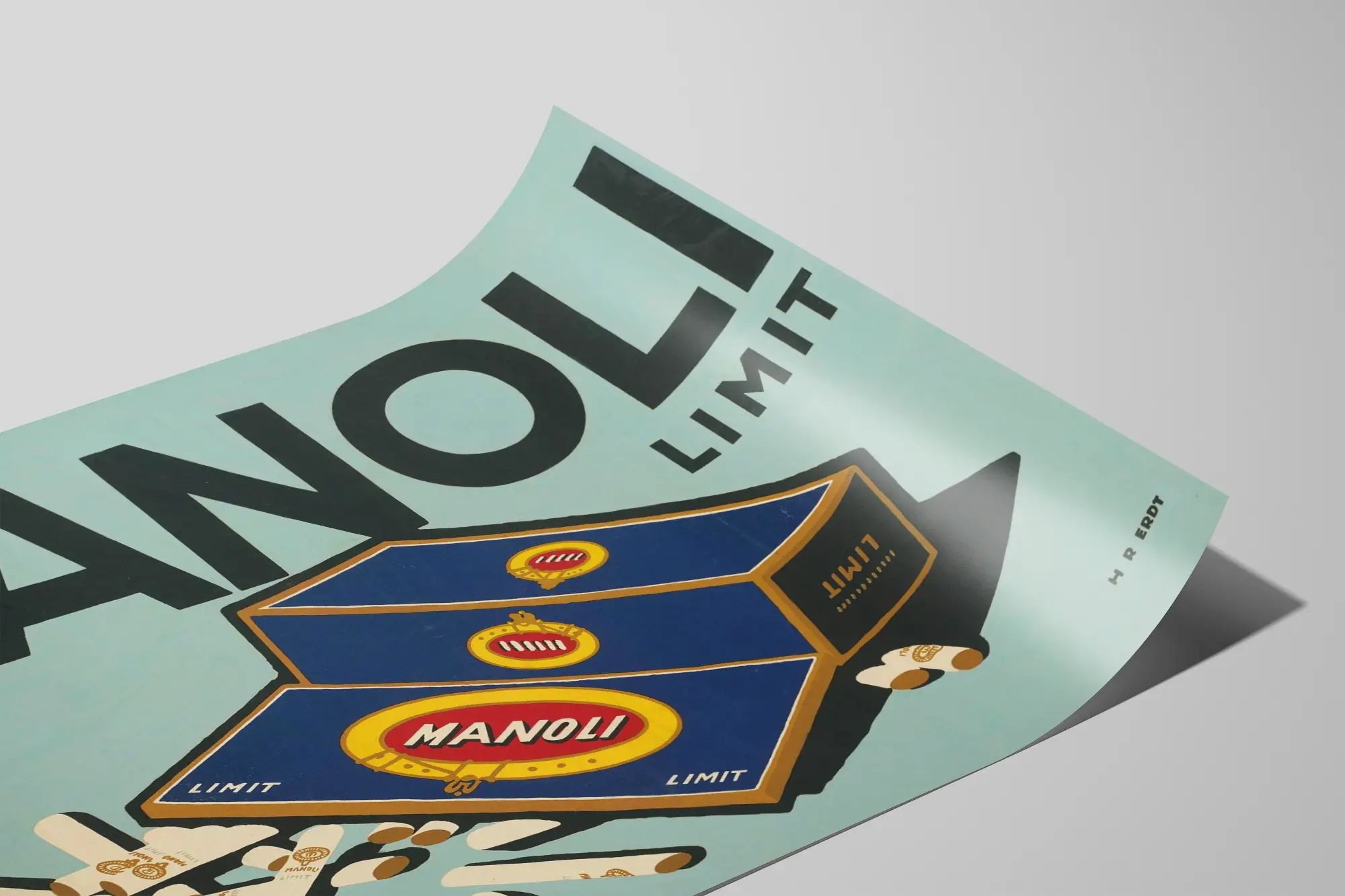 Cette affiche vintage publicitaire Manoli Limit est un poster original idéal pour une décoration murale au style rétro et authentique. Au centre de cette création graphique, une boîte de cigarette bleu marine est représentée avec précision sur un fond coloré bleu clair mat. Le packaging, ouvert sur le côté, dévoile plusieurs cigarettes stylisées posées de manière dynamique autour de la boîte. L'affiche utilise des couleurs dominantes sobres comme le bleu, le noir, et le beige, accentuées par des touches de rouge et de jaune, ce qui apporte de la vitalité à la composition tout en conservant une esthétique classique.