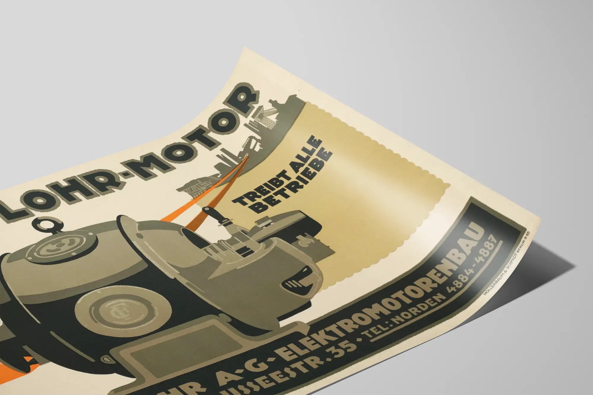 Cette affiche vintage publicitaire met en avant le moteur Flohr, fabriqué par la société Carl Flohr A.G., spécialisée dans la construction de moteurs électriques à Berlin. Avec des couleurs sobres dominées par des nuances de gris, noir et touches d'orange, cette décoration murale industrielle capture l'esprit et l'esthétique des affiches techniques anciennes. Le moteur est représenté en gros plan au centre de l'affiche, illustrant avec précision ses formes mécaniques robustes, tandis qu'en arrière-plan, on devine une silhouette d'usines, soulignant l'utilisation industrielle du moteur Flohr. Cette affiche murale est idéale pour une décoration d'intérieur à thème industriel ou vintage, apportant une touche authentique d'ingénierie et d'histoire technique à un espace moderniste ou rétro. Parfait comme poster décoratif pour les amateurs de design technique, d'histoire industrielle ou d'objets rares, ce visuel inspire à la fois fonctionnalité et esthétique mécanique. Le texte en allemand, clairement visible, accentue le style rétro et authentique de cette décoration murale tout en indiquant l'adresse et les coordonnées de l'entreprise, ce qui renforce son aspect historique. En tant qu'affiche décorative, elle peut être intégrée dans des espaces de travail, ateliers, lofts urbains ou salons modernes qui valorisent les objets chargés d'histoire. Ce poster se distingue par un graphisme géométrique mêlant simplicité et efficacité visuelle, mêlant typographie vintage et illustration technique. C'est un excellent choix pour ceux qui recherchent une touche unique et narrative dans leur décoration murale, évoquant les débuts de l'ère industrielle allemande et la puissance des moteurs électriques à cette époque. Ajouter cette affiche dans votre collection ou votre décor, c'est faire revivre un morceau d'histoire industrielle tout en sublimant l'espace grâce à son rendu graphique impactant et sophistiqué.