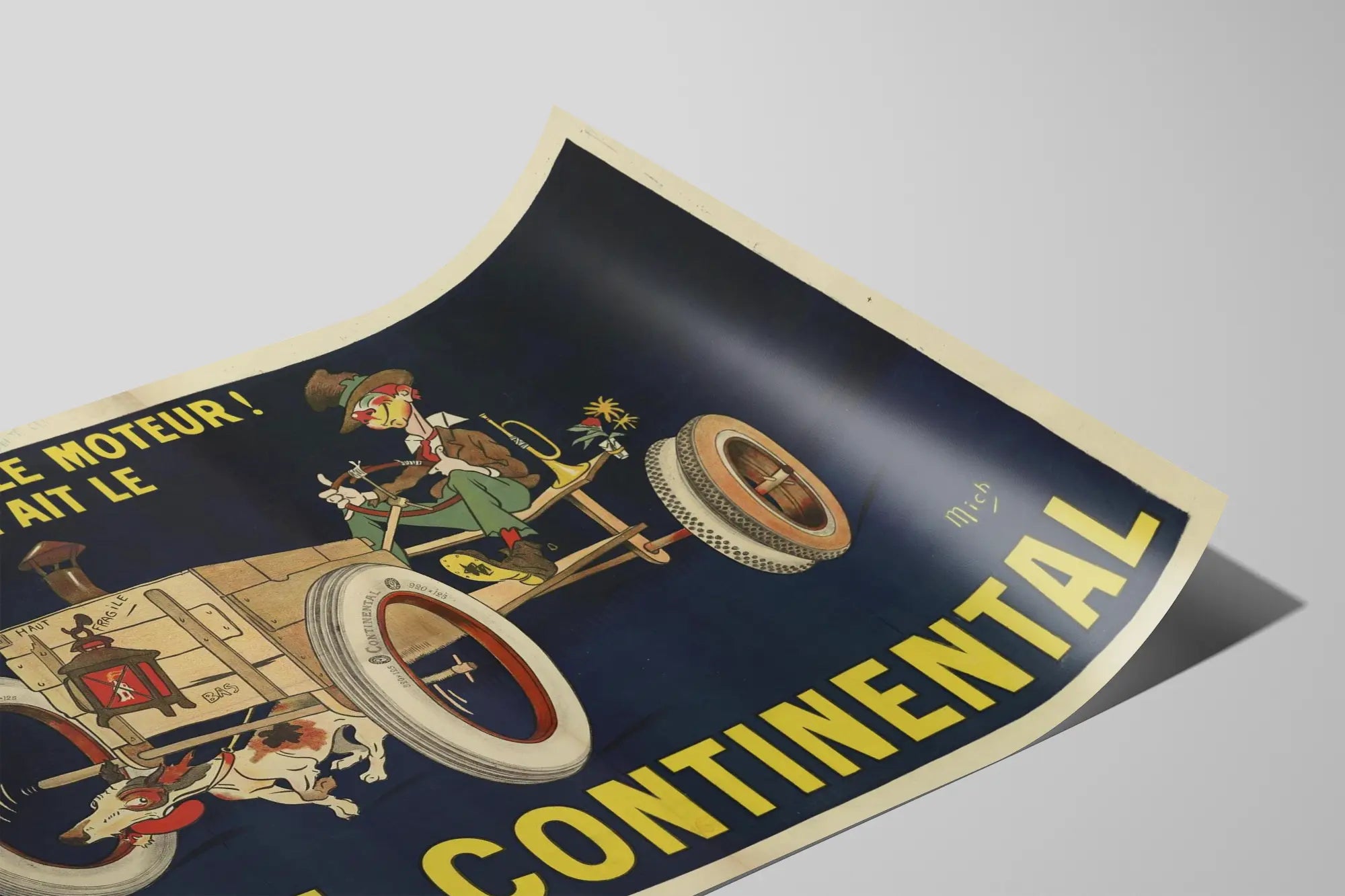 Cette affiche vintage publicitaire met en avant la célèbre marque de pneus Continental avec une illustration humoristique et originale. Sur un fond sombre, une voiture rustique et minimaliste est imaginée avec seulement des pneus Continental, accompagnée d’un personnage caricatural et d’un chien courant, soulignant que peu importe la motorisation, la qualité des pneus est primordiale. Ce poster vintage est une pièce de décoration murale pleine de caractère qui évoque l’époque des débuts de la publicité automobile. Les couleurs vives, notamment le jaune du lettrage et les détails colorés du dessin, apportent une touche rétro dynamique, parfaite pour un intérieur au style industriel ou vintage. Ce type d’affiche inspire une ambiance décalée et authentique, idéale pour une collection dédiée à la publicité ancienne ou pour orner un atelier, un garage ou un espace créatif. Le texte en lettres capitales jaunes “QU’IMPORTE LE MOTEUR ! POURVU QU’ON AIT LE PNEU CONTINENTAL” invite à la confiance dans la robustesse et la fiabilité des pneus, parfaitement mise en valeur par la représentation caricaturale. Ce tableau vintage représente un objet décoratif murale charmant, mêlant art graphique et histoire industrielle. Une belle affiche pour enrichir une décoration murale avec une touche d’humour et de nostalgie, tout en mettant en lumière un symbole d’innovation technique dans le domaine de l’automobile.