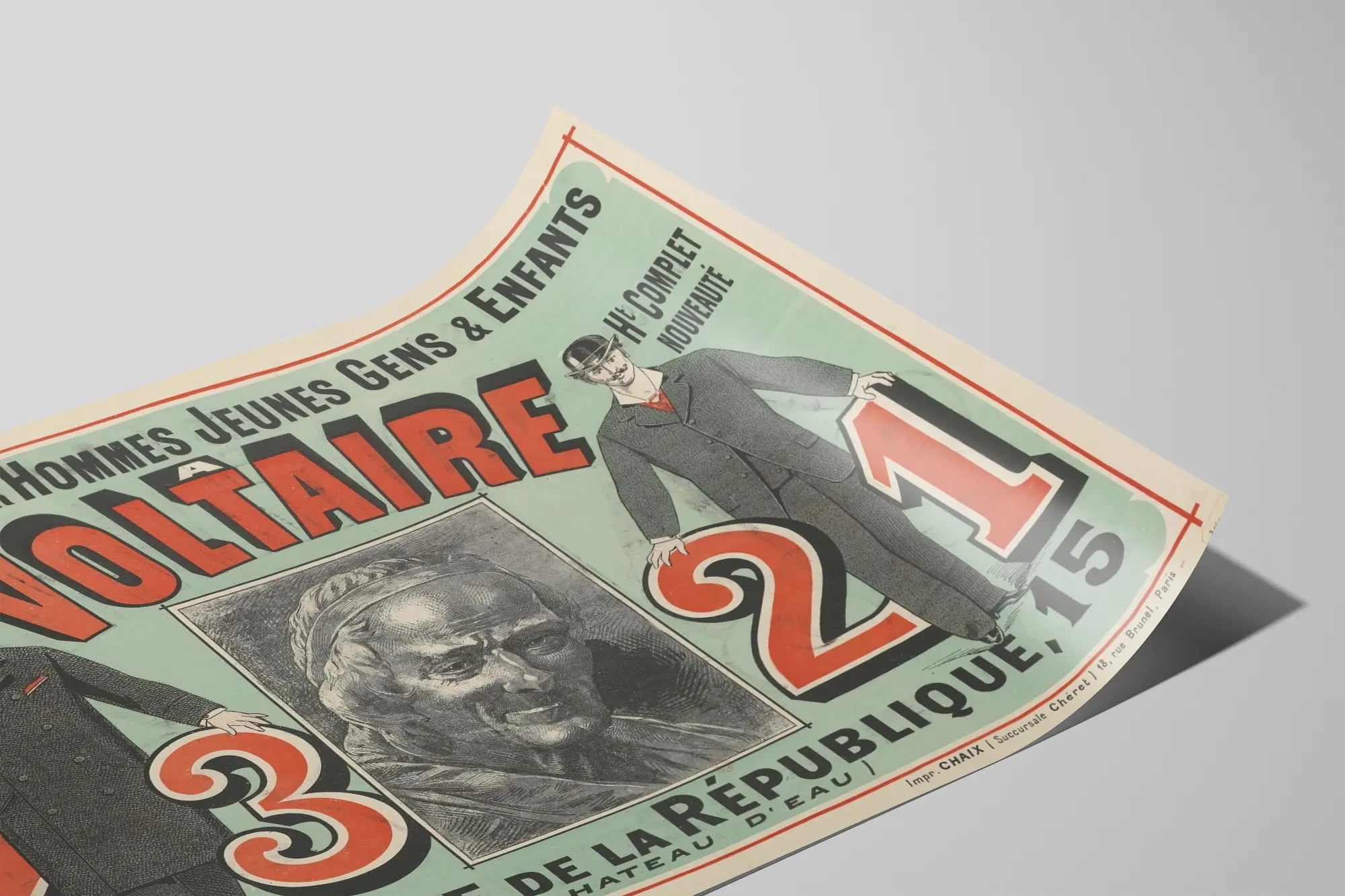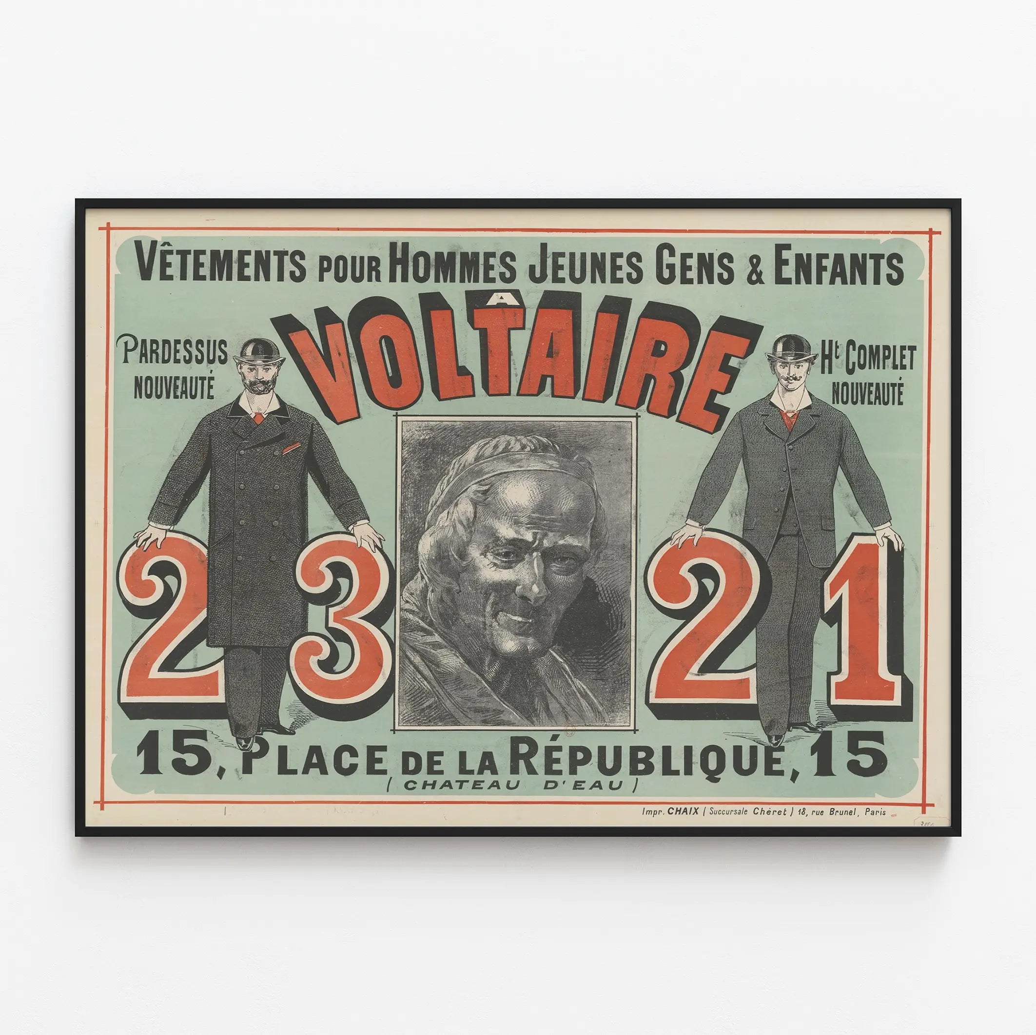 Cette affiche publicitaire vintage met en avant la marque Voltaire, spécialisée dans les vêtements pour hommes, jeunes gens et enfants. Le poster présente un style ancien avec une composition graphique typique des affiches du début du XXe siècle. On y voit deux hommes élégamment habillés, vêtus de pardessus et de complets classiques, tenant de grands chiffres rouge et noir (23 et 21) indiquant sans doute un numéro de rue ou une adresse. Au centre figure un portrait gravé en noir et blanc, évoquant peut-être la figure historique qui a inspiré le nom de la marque, ainsi qu'une typographie large et colorée pour le nom « VOLTAIRE », qui attire immédiatement le regard. Cette décoration murale offre un charme rétro et un aspect typographique très artistique, idéal pour évoquer l’univers de la mode masculine d’antan. L'affiche peut être un magnifique objet de décoration murale pour un intérieur au style vintage, une boutique de vêtements ou une pièce dédiée au design graphique et à l'histoire de la mode. Elle constitue un superbe poster d’époque qui combine illustration, typographie et publicité ancienne pour créer une ambiance authentique et élégante.