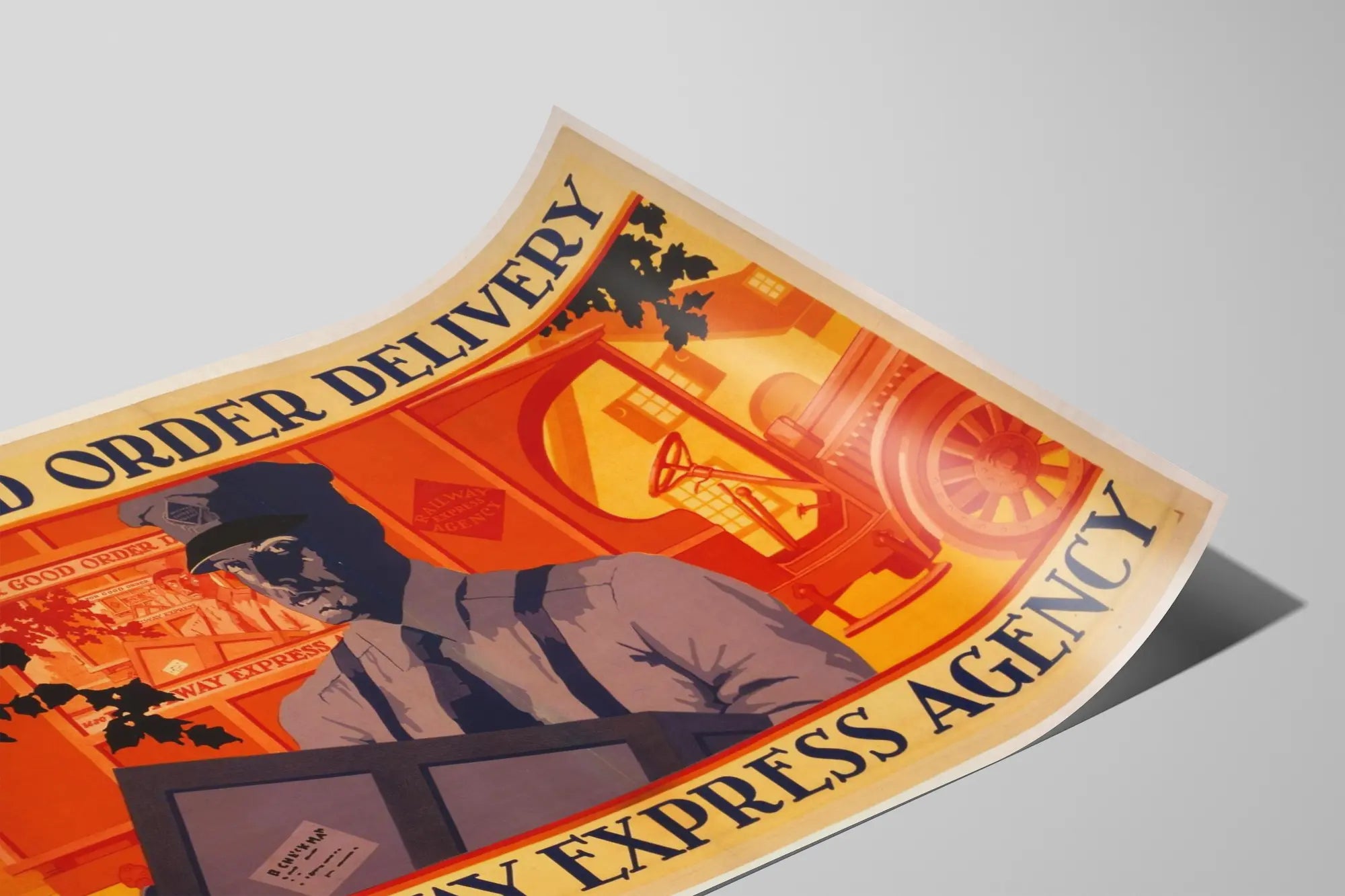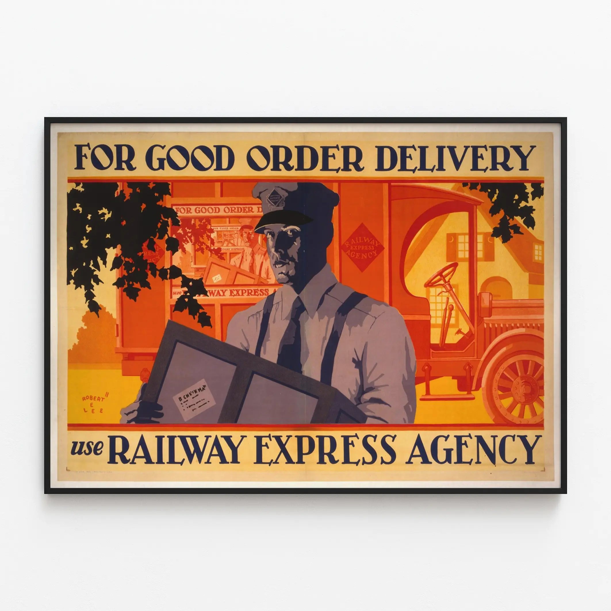 Cette affiche vintage représente un agent de livraison en uniforme tenant un colis devant un camion rouge marqué "Railway Express Agency". Le style graphique utilise des tons chauds dominés par l'orange, avec des zones d'ombre bleu-gris sur le personnage principal, créant un contraste puissant et une atmosphère rétro. En haut, le texte "FOR GOOD ORDER DELIVERY" incite à choisir ce service de livraison, soulignant la fiabilité et la qualité du transport. En bas, le message "use RAILWAY EXPRESS AGENCY" vient compléter cette invitation à confier ses colis à cette agence express. Cette décoration murale au style rétro et industriel est idéale pour les amateurs d'affiches anciennes, de décoration vintage ou pour créer une ambiance authentique rappelant l'âge d'or du transport par rail et route. Le format poster permet d'apporter une touche originale à un bureau, une pièce dédiée au travail ou un espace de vie, valorisant ainsi le thème de la livraison et du service client. Ce tableau mural est une invitation à l'organisation et à la confiance dans les services express, parfaite pour une décoration murale qui allie esthétisme et histoire. Que ce soit en simple affiche ou en objet décoratif encadré, il offrira un focus unique sur le thème de la logistique et du transport, faisant de cette œuvre un choix décoratif fort et évocateur.