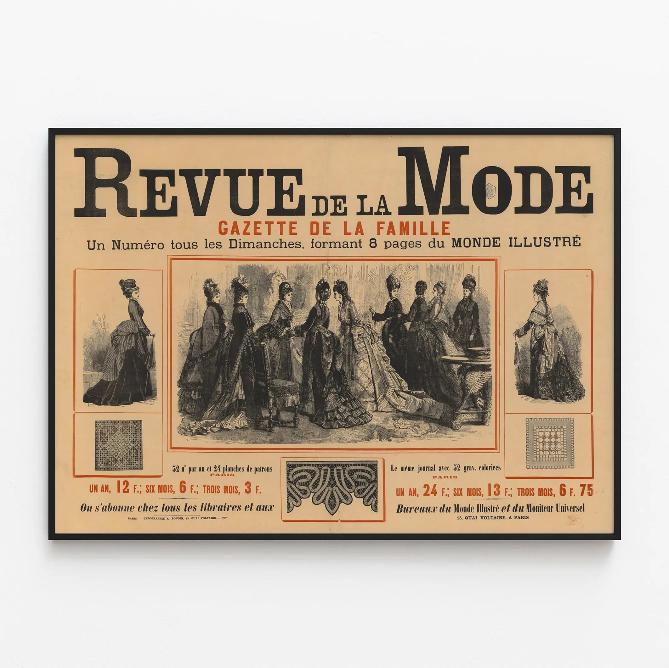Découvrez cette affiche vintage représentant la couverture de la Revue de la Mode, Gazette de la Famille, une publication illustrée du monde de la mode. Ce poster unique capture l'esthétique classique de la mode féminine d'époque, avec des illustrations précises de tenues élégantes, coiffures soignées et détails textiles raffinés. Parfaite pour une décoration murale dans un intérieur au style rétro ou une boutique dédiée à la mode et à l'histoire du textile, cette affiche apporte une touche d'authenticité et de charme ancien. Elle montre plusieurs femmes en tenue d'époque, assemblées dans un cadre intérieur, illustrant l'élégance et le raffinement vestimentaire. Cette décoration murale s'adresse aux amateurs de vintage et de design historique, idéale pour personnaliser un salon, une pièce de lecture ou un espace créatif. Ce tableau graphique en noir et blanc sur fond sépia évoque l'atmosphère des journaux illustrés du 19e siècle et souligne l'importance de la presse mode familiale à cette période. Un poster stylisé qui mêle à la fois art et patrimoine, offrant une pièce décorative qui interpelle par son réalisme et son côté documentaire. Intégrer ce poster vintage à votre décoration murale, c'est aussi valoriser l'histoire de la mode et la transmission des savoir-faire stylistiques au fil des générations. Ce tableau se distingue par sa composition équilibrée entre les illustrations de tenues, les motifs décoratifs et les inscriptions typographiques grandes et lisibles, créant un effet visuel à la fois esthétique et informatif. Une affiche parfaite pour les passionnés de mode ancienne, les collectionneurs d'affiches rétro et les professionnels du design intérieur cherchant à faire revivre une atmosphère d'époque avec authenticité.