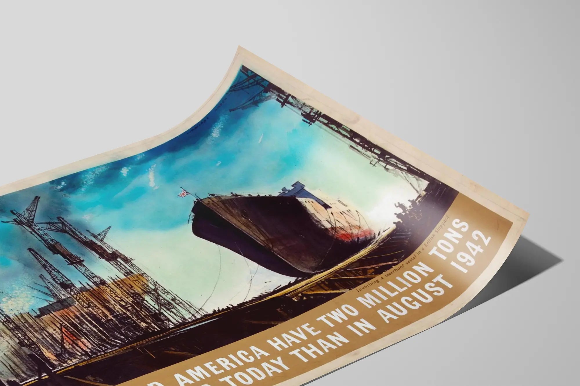 Cette affiche vintage illustre la puissance maritime renforcée de la Grande-Bretagne et de l'Amérique, mettant en avant une augmentation significative de la capacité de transport maritime, avec deux millions de tonnes supplémentaires par rapport à août 1942. Représentant un navire marchand lancé dans un chantier naval britannique, cette décoration murale capture l'ambiance industrielle et la dynamique de la production navale pendant une période charnière. Avec ses couleurs intenses et son style graphique marquant, cette affiche est une pièce unique idéale pour les amateurs d'histoire, de marine et de design rétro. Elle s'intégrera parfaitement comme tableau ou poster dans un intérieur à la recherche d'une touche historique et authentique. Que ce soit dans un salon, un bureau ou une bibliothèque, elle apportera une atmosphère maritime et un récit visuel puissant autour du thème du transport et de l'effort industriel. Cette œuvre favorise une décoration murale originale, combinant un style artistique du milieu du 20e siècle avec un message historique fort, symbolisant la montée en puissance des capacités logistiques pendant la Seconde Guerre mondiale. Ce poster est aussi une excellente idée pour personnaliser un espace dédié à la passion maritime ou à la décoration vintage industrielle.