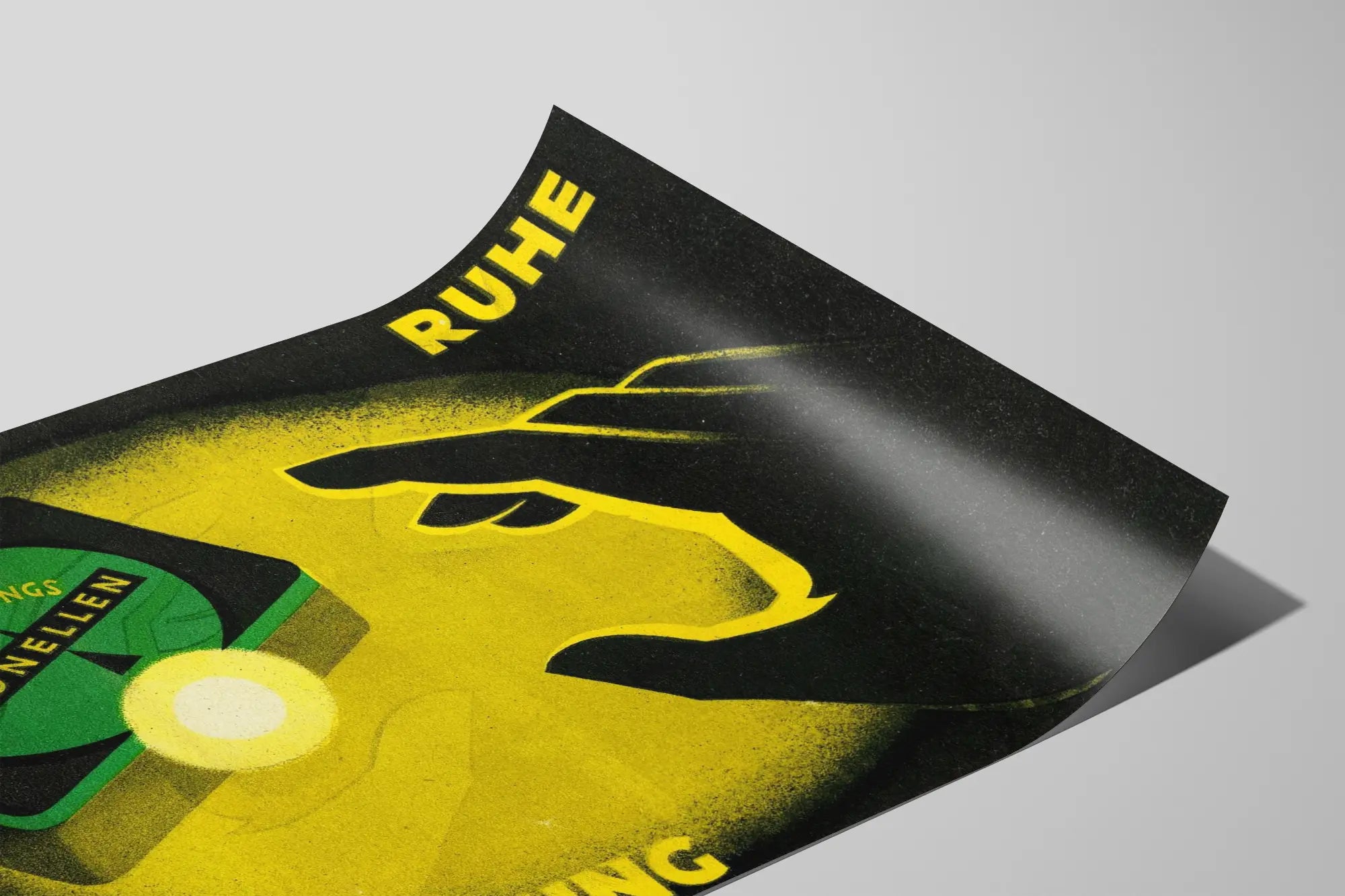Son design graphique, marqué par un style minimaliste et un jeu d'ombres nettes, fait de cette affiche une décoration murale à la fois élégante et évocatrice. Le texte "Ruhe" et "Entspannung" au cadrage bien visible invite directement à la relaxation, renforçant l'effet apaisant de cette composition. Accrochée à un mur, elle devient un élément central de la décoration, incitant à une pause calme dans un environnement au rythme souvent accéléré.