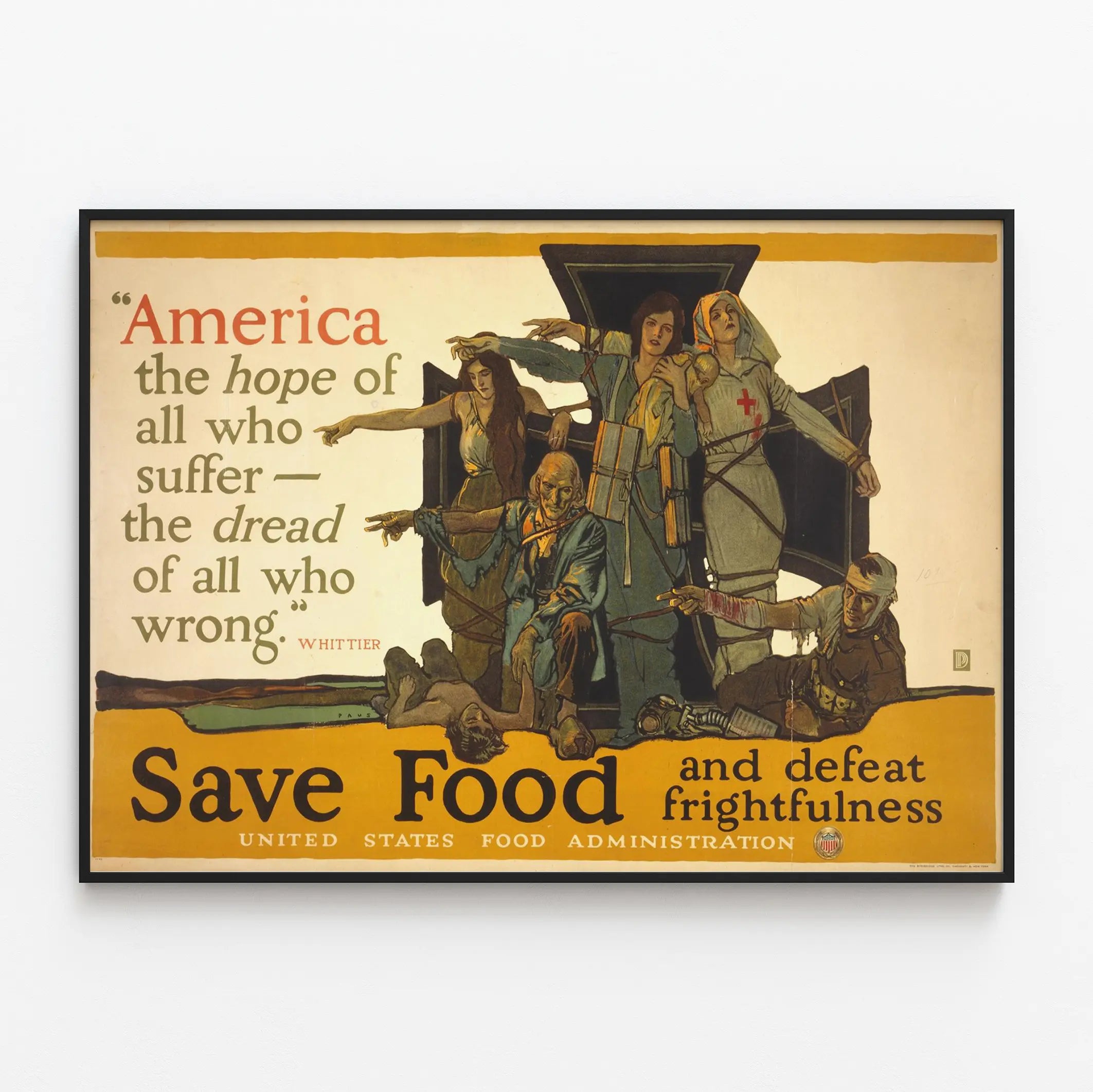 Cette affiche vintage de la United States Food Administration est une pièce emblématique de décoration murale qui prône l'importance de la préservation de la nourriture en période de crise. Elle met en scène plusieurs personnages illustrant l'espoir et la souffrance, avec un message fort : « America the hope of all who suffer – the dread of all who wrong », incitant à sauver la nourriture pour vaincre la peur et l'adversité. Ce poster possède un graphisme rétro marqué par des couleurs chaudes et une composition qui attire immédiatement le regard, idéale pour les amateurs d'histoire ou de décorations murales au style ancien. Ce tableau décoratif peut habiller un mur d'intérieur avec une âme et un aspect intemporel, parfait dans un bureau, une bibliothèque ou un salon, tout en rappelant l'importance des campagnes de sensibilisation. Le style vintage de cette affiche la rend unique et originale, mêlant illustration et typographie d'époque, pour une décoration murale chargée d'émotion et de sens.