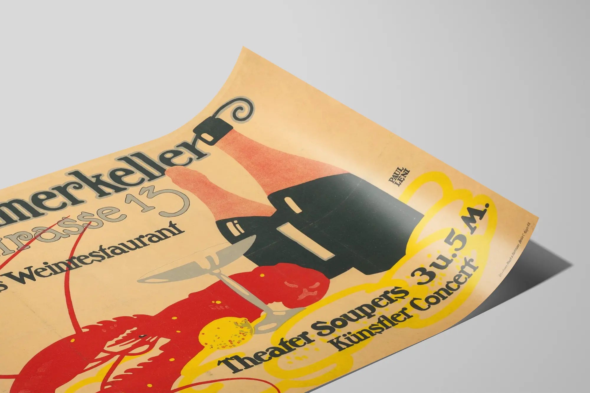 Cette affiche vintage illustre la publicité du Schlemmerkeller, un restaurant de vins élégant situé au 13 Jägerstrasse. Ce poster publicitaire au style rétro met en avant l'ambiance raffinée et gourmande de cet établissement, spécialisé dans le service de vins accompagnés de repas délicieux. Le visuel met en scène deux bouteilles de vin, une coupe à champagne, ainsi qu'un homard rouge avec un citron, éléments qui soulignent le caractère luxueux et festif du restaurant. Le texte en allemand mentionne également des « Theater Soupers » et des concerts d'artistes, suggérant une expérience culturelle complète autour de la gastronomie et du vin. Cette décoration murale est idéale pour les amateurs de posters vintage, de thèmes liés à la gastronomie, au vin et à la convivialité. Placée dans un salon, une cuisine ou un espace de dégustation, cette affiche apporte une touche élégante et artistique, rappelant l'atmosphère chaleureuse et distinguée des restaurants classiques. Son design épuré et ses couleurs vives captent facilement l'attention, en faisant un tableau mural unique et chargé d'histoire. Pour une décoration murale originale et authentique, ce poster Schlemmerkeller est un choix parfait qui marie esthétique, culture et passion pour le vin et la bonne cuisine.