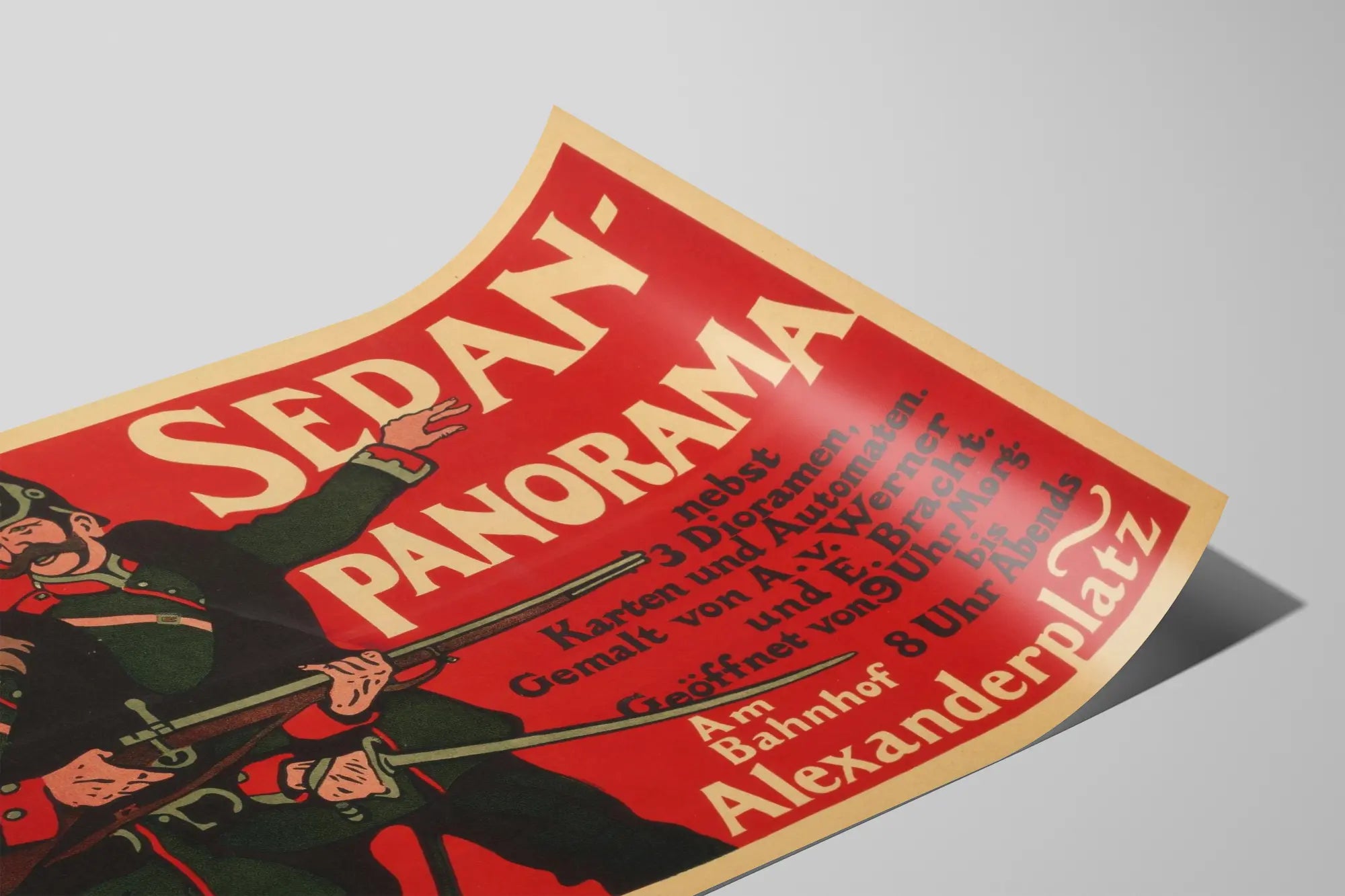 Cette affiche vintage publicitaire, illustrée dans un style graphique remarquable, met en scène deux soldats en uniforme uniformément vert avec des casques à pointe caractéristiques, tenant un fusil à baïonnette. Le fond rouge vif attire immédiatement le regard et contraste avec les personnages et le texte en lettres majuscules blanches et noires. Le texte en langue allemande fait la promotion d'un "Sedan Panorama" situé au Bahnhof Alexanderplatz, avec des indications d'horaires d'ouverture de 9 heures du matin à 8 heures du soir, et mentionne également la présence de dioramas, cartes et automates. Ce poster constitue une pièce d'histoire graphique et militaire, parfaite pour une décoration murale inspirée par le style vintage, l'affichage historique ou les thèmes militaires. Grâce à ses couleurs éclatantes et son design vintage, ce poster apportera une touche rétro authentique à tout intérieur, qu'il soit moderne ou classique. Ce type de décoration murale est idéal pour les amateurs d'affiches anciennes, d'art graphique ou d'histoire militaire. En format poster, il peut être encadré pour sublimer un mur et créer un point focal original et chargé de caractère. Cette affiche est une invitation à découvrir une époque à travers une image évocatrice et saisissante, parfaite pour divers styles de décoration, du rétro-chic au style industriel.