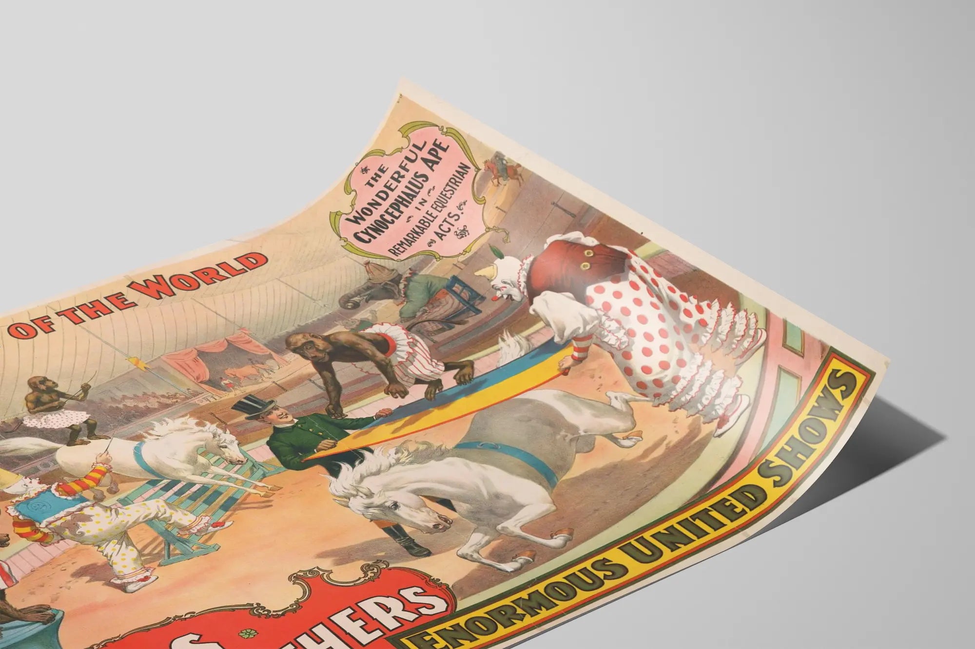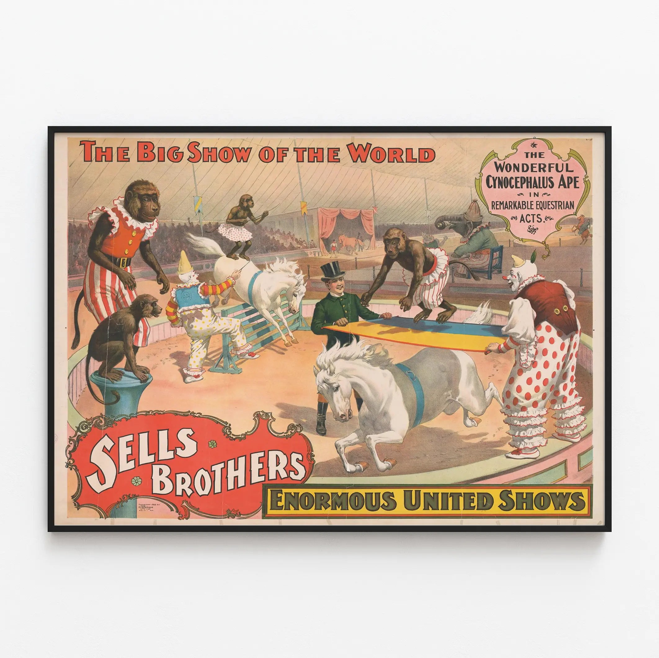Cette affiche vintage originale met en scène le spectacle équestre des Sells Brothers, intitulé « The Big Show of the World ». Au centre, des singes cynocéphales vêtus de costumes colorés réalisent des acrobaties remarquables avec des chevaux blancs dans un cirque animé. L'image illustre un numéro étonnant où les singes montent et sautent par-dessus des obstacles, accompagnés de clowns costumés, ajoutant une touche d'humour et de fantaisie à la représentation. Ce poster de décoration murale se distingue par ses couleurs vives et son style rétro typique des affiches de spectacle du début du XXe siècle. Parfait pour apporter une atmosphère vintage et originale à un intérieur, ce tableau mural est un choix idéal pour les amateurs de décoration à thème circassien ou animalier. La composition dynamique et les détails soignés offrent un attrait visuel unique, faisant de cette affiche un élément décoratif intrigant. Que ce soit pour une collection d'affiches anciennes ou pour embellir un salon, un bureau ou une salle de loisirs, cette œuvre imprimée capture l’essence des spectacles équestres traditionnels et l’univers pittoresque des cirques d’autrefois. Son style évoque la nostalgie et rappelle l’importance culturelle des spectacles itinérants dans l’histoire du divertissement. Cette affiche est un excellent exemple d’affiche décorative artistique qui met en valeur la thématique du cirque et des animaux dressés, idéale pour enrichir un mur avec une touche d’originalité et d’histoire.