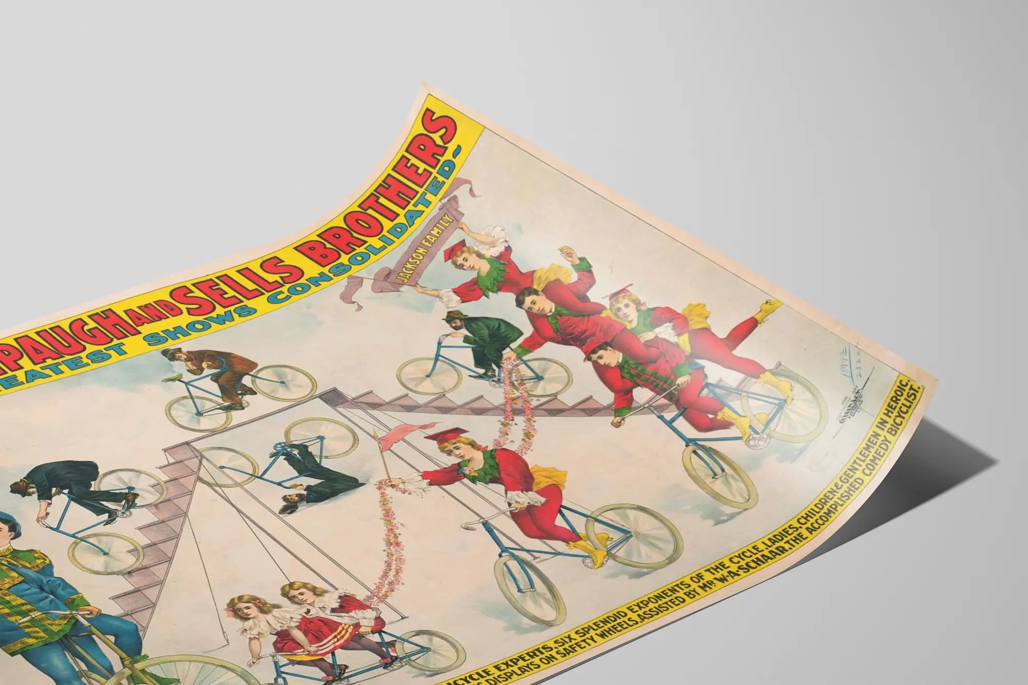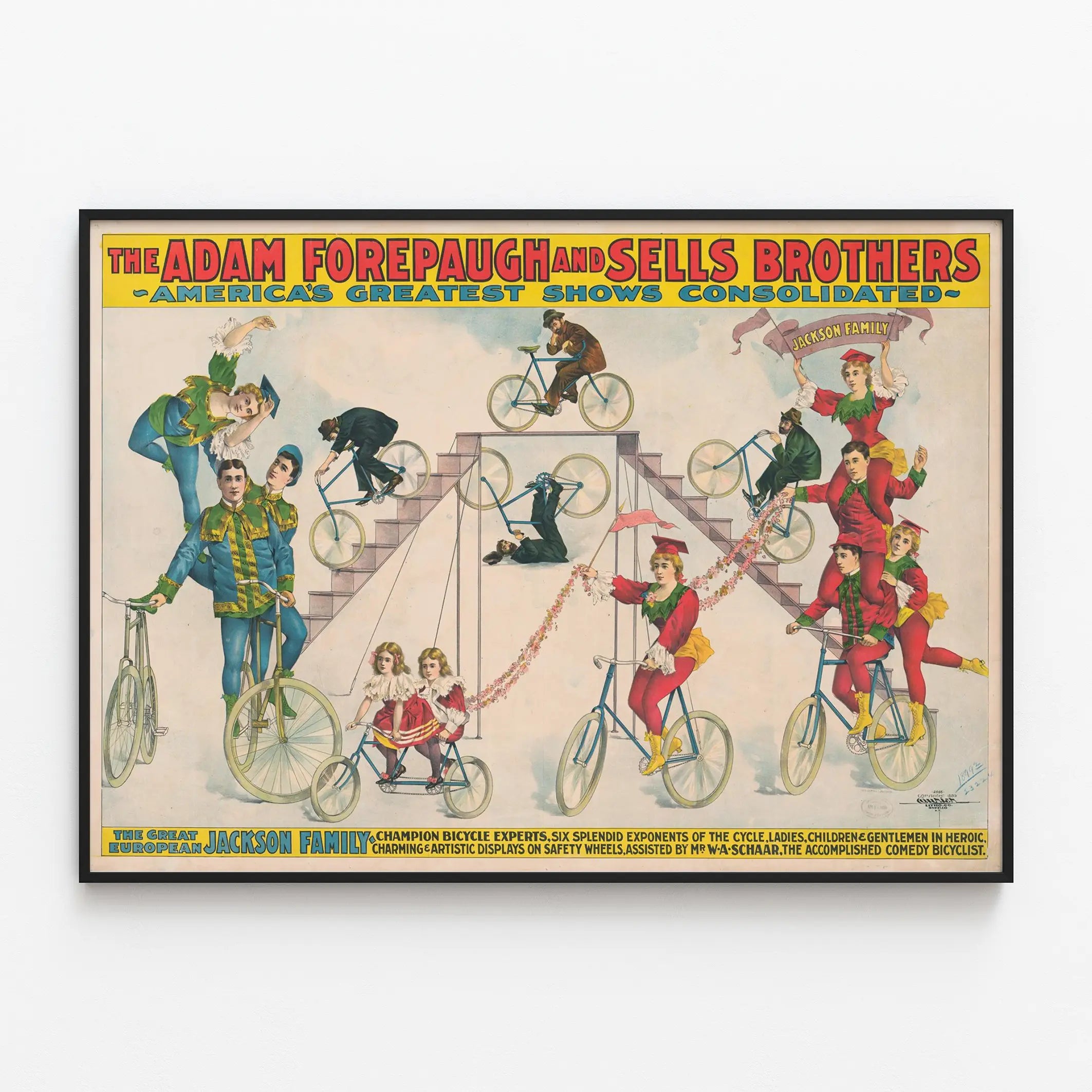 Découvrez cette superbe affiche vintage mettant en scène The Adam Forepaugh and Sells Brothers, regroupant le plus grand spectacle américain avec la fameuse famille Jackson. Ce poster, typique des affiches de cirque et spectacles itinérants de la fin du 19e siècle, illustre une performance acrobatique exceptionnelle à vélo. Sur cette décoration murale, vous pouvez admirer de nombreux artistes habillés de costumes colorés en pleine démonstration d'équilibre et de figures athlétiques sur des bicyclettes, illustrant le talent et la créativité de ces artistes de l'époque. Ce tableau mural est parfait pour apporter une touche rétro et artistique à votre intérieur, évoquant l'univers fascinant des spectacles et des cirques anciens. L'affiche présente des couleurs vives et un style graphique détaillé qui la rendent idéale comme décoration murale pour les amateurs d'art vintage et de scènes de spectacles historiques. Cette affiche de décoration murale est un excellent choix pour personnaliser un salon, un bureau ou une salle dédiée à la collection d'objets artistiques, en apportant un cachet authentique et un charme d'autrefois. Une décoration murale unique qui capture l'esprit des shows et la magie des performances au vélo acrobatique, soulignant la valeur esthétique et culturelle de cette époque. Parfaite pour les collectionneurs ou pour ceux qui souhaitent un poster au style ancien, riche en histoire et en dynamisme visuel. Cette oeuvre de décoration murale est un hommage vibrant aux artistes et à l'univers du spectacle itinérant, mettant en avant une scène dynamique et festive, pleine de mouvements et de couleurs. Offrez à vos murs une affiche qui raconte une histoire, combinant la précision des illustrations anciennes à une atmosphère captivante et nostalgique.