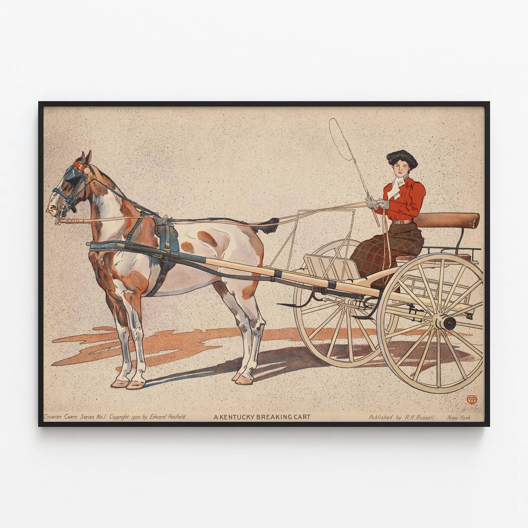 Découvrez cette affiche vintage élégante intitulée "A Kentucky Breaking Cart", une pièce de décoration murale unique qui rend hommage à l'art du début du XXe siècle. Cette illustration fine et détaillée met en scène une scène campagnarde typique avec un cheval attelé à un char léger, appelé "breaking cart" typique du Kentucky. La finesse du dessin au trait et la palette de couleurs douces avec des touches de brun, beige, et rouge donnent à ce poster un charme authentique et nostalgique. Cette affiche s'intègre parfaitement dans un décor classique ou rustique, apportant une touche d'histoire et d'élégance à votre intérieur. Que ce soit dans un salon, un bureau ou une bibliothèque, ce tableau mural capte le regard avec son illustration détaillée d'un attelage à l’ancienne, mettant en valeur le cheval et la conductrice habillée à la mode d’époque. Le style artistique est marqué par une précision et une harmonie dans les teintes qui séduira les amateurs de décoration murale vintage et les passionnés d’art hippomobile. Le poster "A Kentucky Breaking Cart" incarne une scène de la vie rurale américaine, exprimée avec un savoir-faire graphique remarquable. L’image montre clairement les éléments typiques de ce type d’attelage, notamment les grandes roues en bois, les traits de harnais et la tenue d’époque, ce qui en fait aussi un objet de collection pour les amateurs d’histoire et d’art. Cette décoration murale apportera une atmosphère chaleureuse et authentique à votre espace, tout en soulignant un goût pour les illustrations classiques et les ambiances campagnardes. Convient aussi bien dans un cadre privé que professionnel, notamment pour les espaces dédiés à la culture, à l’histoire ou aux arts décoratifs. L’affiche peut être encadrée ou accrochée telle quelle pour revendiquer un style vintage assumé. En résumé, cette œuvre graphique sur poster est une invitation à plonger dans un univers ancien où l’élégance se mêle à la vie quotidienne au tournant du siècle, parfaite pour enrichir votre collection de décoration murale avec une pièce à la fois esthétique et pleine de caractère.