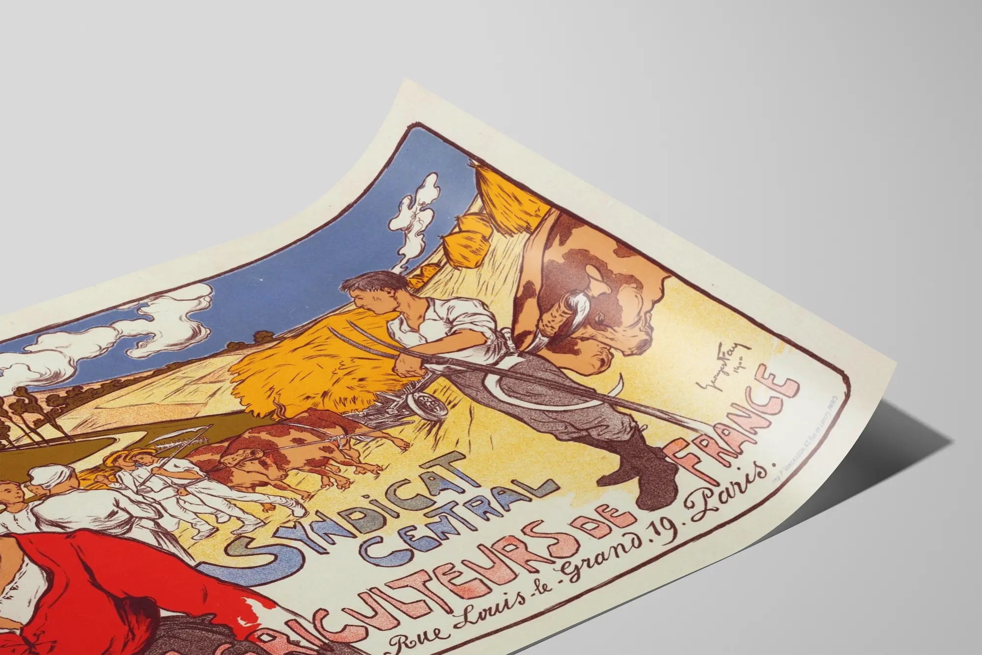Cette affiche vintage illustre le Syndicat Central des Agriculteurs de France, un hommage graphique aux travailleurs de la terre. L'œuvre met en scène plusieurs figures agricoles en pleine activité dans un décor champêtre. Au premier plan, une femme vêtue d'un chemisier rouge et d'un foulard blanc symbolise la force féminine dans le monde rural. À droite, un homme tient une faux, prêt à faucher les champs dorés, tandis que deux bœufs tirent une charrette chargée de bottes de foin. En arrière-plan, des agriculteurs équipés de râteaux poursuivent leur tâche sous un ciel bleu barré de nuages blancs. Le style graphique est marqué par des lignes nettes et des couleurs chaudes qui renforcent l'atmosphère rurale et authentique. Le lettrage manuscrit en lettres colorées décore le bas de l'affiche, indiquant le nom du syndicat et son adresse parisienne, témoignant d'une époque où l'agriculture était la pierre angulaire de la société. Cette affiche décorative est un excellent choix pour ceux qui souhaitent évoquer le patrimoine agricole français à travers un poster mural original. Idéale pour une décoration murale dans une cuisine, un bureau ou un espace d'accueil, elle apporte une touche historique et artisanale. Ce tableau affiche un style qui séduira les amateurs d'art populaire et les passionnés de l'histoire sociale. Sa composition équilibrée et ses teintes naturelles en font un élément décoratif chaleureux, ancré dans un contexte rural français traditionnel. Avec cette affiche du Syndicat Central des Agriculteurs de France, invitez un morceau d'histoire paysanne et une atmosphère champêtre dans votre intérieur.