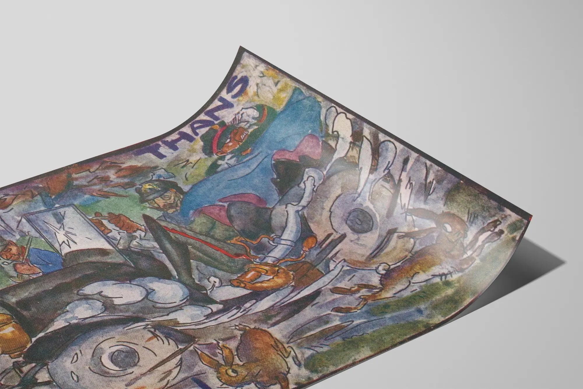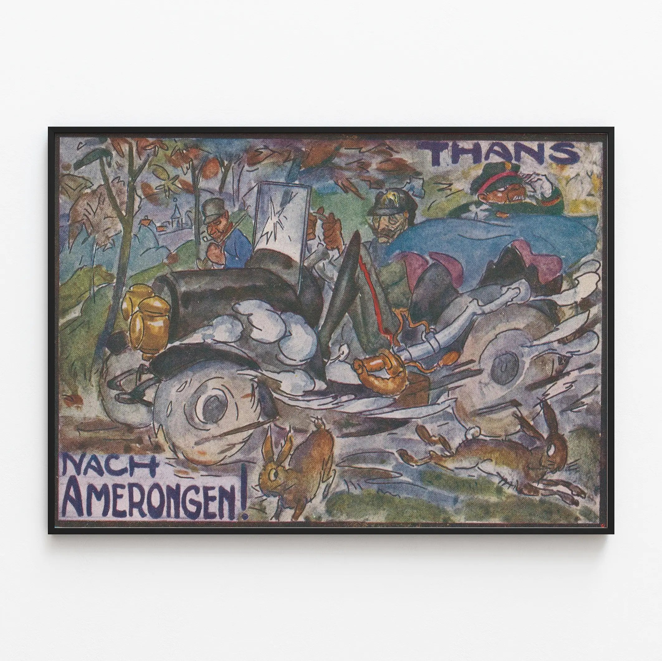 Cette affiche vintage intitulée "Thans Nach Amerongen" illustre une scène dynamique et pleine de mouvement mettant en scène une voiture militaire ancienne avec plusieurs soldats à bord. L’image est riche en couleurs vives et en détails stylisés, avec un style artistique qui mêle réalisme et touche caricaturale. La voiture semble en pleine vitesse, avec des roues dessinées de façon presque abstraite, et plusieurs lièvres en train de sauter sur le chemin ajoutent une note de vie et de nature au décor. Les soldats, reconnaissables par leurs uniformes et casques, entretenant une atmosphère d’époque, renforcent le caractère historique ou militaire de cette œuvre. L’arrière-plan présente des éléments naturels et architecturaux esquissés, notamment des arbres et une silhouette de bâtiments, conférant une profondeur à la composition. Ce poster est une excellente proposition pour une décoration murale originale, idéale pour les passionnés d’art rétro, d’histoire militaire ou d’illustrations au style expressif et coloré. Que ce soit dans un salon, un bureau ou un espace dédié à la collection d'affiches, ce tableau mural apporte une ambiance unique et pleine d’énergie. Son rendu pictural et ses détails narratifs font de cette affiche un élément décoratif à la fois esthétique et évocateur, capable de susciter la curiosité et le dialogue. Parfaite pour enrichir un intérieur avec une touche artistique rétro, cette décoration murale s’intègre dans les styles éclectiques et vintage, apportant contraste et dynamisme à vos murs.