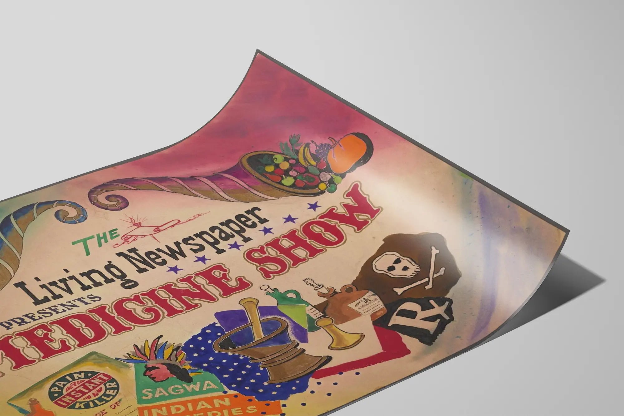 Cette affiche vintage intitulée « The Living Newspaper Presents Medicine Show » est un magnifique exemple de décoration murale au style rétro. Elle représente de manière colorée et illustrée un spectacle de remèdes traditionnels et patapharmaceutiques, communément appelés "medicine shows". L’affiche présente un ensemble d’éléments iconographiques tels qu’une corne d’abondance remplie de fruits et légumes sur la droite, tandis que la corne de gauche est garnie de bouteilles, de boîtes et de flacons, suggérant un mélange entre médecine traditionnelle et potions diverses. Le centre de l’affiche met en valeur un mortier et un pilon, symboles forts liés à l’art de la préparation des remèdes et des potions. D’autres objets, tels que des fioles, un sac marqué d’un crâne et os croisés, et des documents, renforcent l’atmosphère mystérieuse et ancienne de ce spectacle de médecine populaire. Le texte en grandes lettres rouges "MEDICINE SHOW" accroche immédiatement l’attention, combiné à la typographie typique des affiches anciennes, vous plonge dans une ambiance nostalgique et authentique. Cette décoration murale avec l’inscription « SAGWA INDIAN REMEDIES » suggère également une référence aux plantes et remèdes d’origine indienne, évoquant le savoir ancestral et les plantes médicinales souvent utilisées dans les médecines alternatives. Cette affiche est idéalement conçue pour apporter une touche d’originalité à votre intérieur, que ce soit dans un salon, un bureau ou une boutique à thème vintage. Son style graphique unique et ses couleurs douces dégradées du vert au rose en passant par le jaune, lui confèrent une esthétique à la fois chaleureuse et esthétique. Cette œuvre est parfaite pour les amateurs de décoration murale cherchant à créer une atmosphère intrigante et culturelle, combinant l’histoire ancienne des remèdes populaires avec un style artistique réussi. Choisissez cette affiche pour enrichir votre collection de posters vintage et accentuer un style décoratif unique et évocateur.
