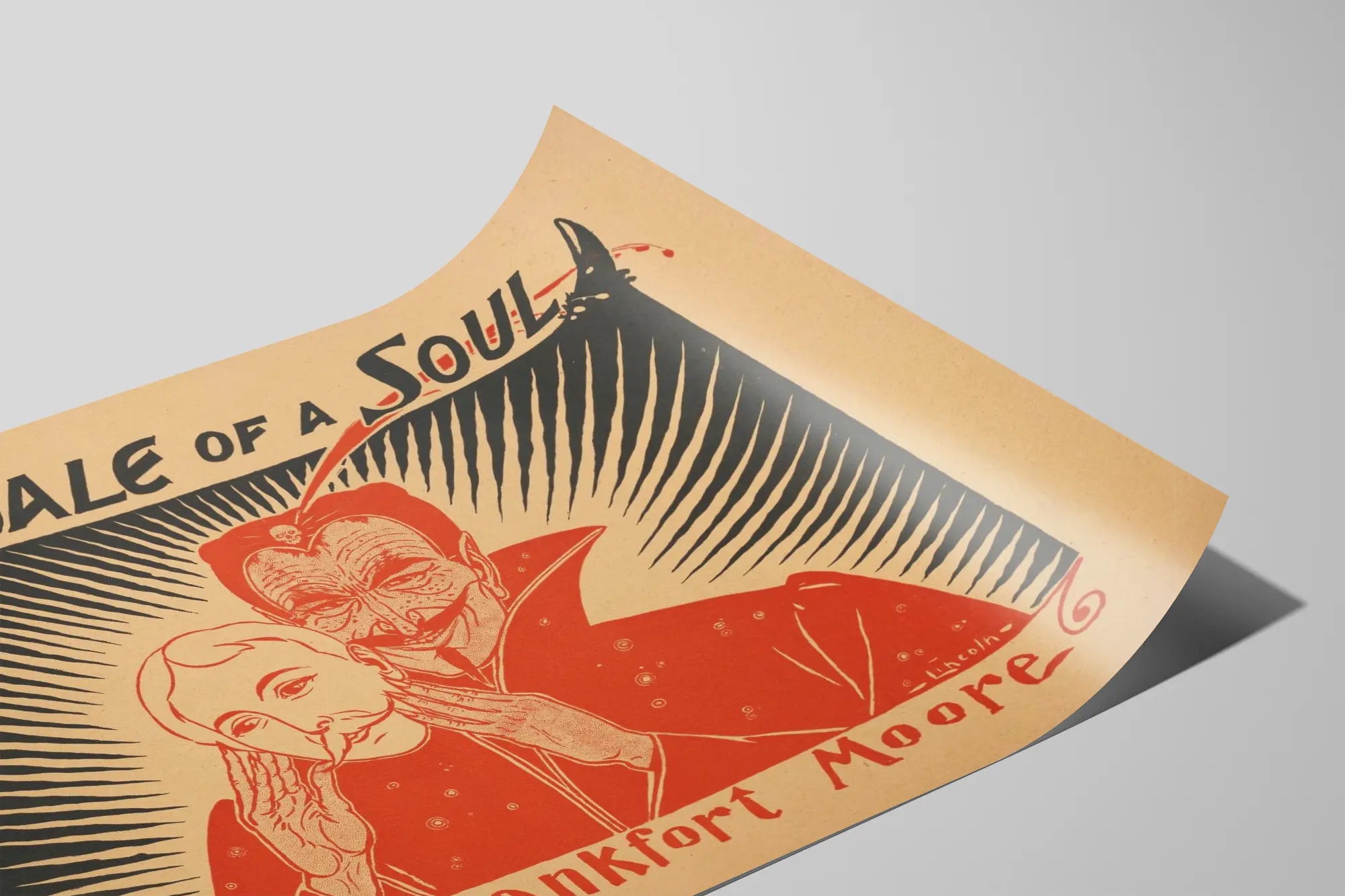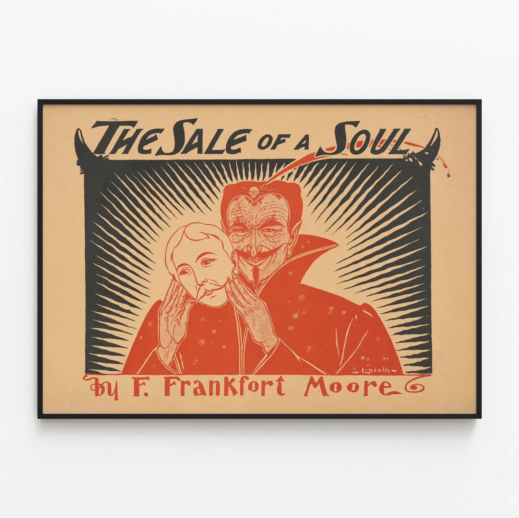 Cette affiche vintage intitulée "The Sale of a Soul" par F. Frankfort Moore offre une décoration murale saisissante, idéale pour les amateurs de graphismes rétro et d'œuvres au style dramatique. Le visuel met en avant un personnage inquiétant, à l'allure presque démoniaque, tenant un masque représentant un visage humain, dans un jeu d'ombres et de lumières très contrasté. Le fond, composé de rayons noirs qui irradient du centre, crée un effet hypnotique renforçant l'ambiance mystérieuse de cette composition. L'utilisation de deux couleurs principales, le noir et un rouge orangé, sur un fond couleur kraft, confère un rendu artistique à la fois classique et puissant, parfaitement adapté à une décoration murale originale. Ce poster au sujet évocateur, "la vente d'une âme", est un choix pertinent pour créer une atmosphère intense et captivante dans un intérieur. Placé dans un salon, un bureau ou une bibliothèque, ce tableau mural ne manquera pas d'attirer les regards et de susciter la réflexion. Cette œuvre graphique ancienne est également parfaite pour une collection d'affiches ou pour apporter une touche vintage à une pièce contemporaine. Sa typographie manuscrite au style ancien complète l'esthétique d'époque tout en affirmant le caractère unique de ce poster décoratif. Que vous recherchiez une affiche intrigante au message fort ou un élément de décoration mural pour personnaliser votre espace, cette reproduction de "The Sale of a Soul" par F. Frankfort Moore s'impose comme un choix évocateur et plein de caractère.