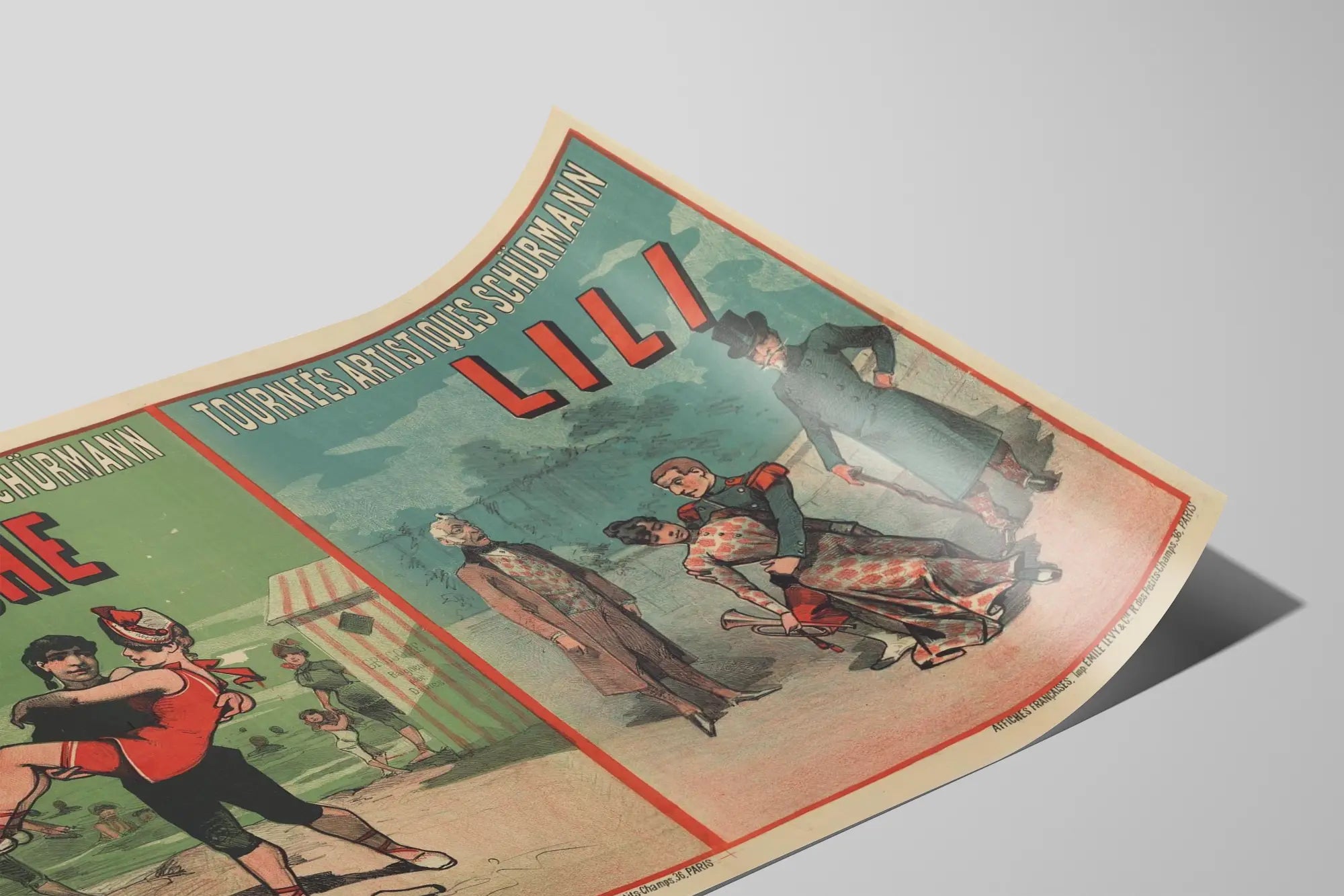 Découvrez cette affiche originale et vintage des Tournées Artistiques Schürmann, présentant les spectacles Niniche et Lili. Cette décoration murale se compose de deux illustrations distinctes juxtaposées, imprimées sur fond pastel aux teintes vert et bleu-gris, rehaussées d'un cadre rouge. Le poster met en scène des personnages dans des situations théâtrales ou de mise en scène artistique, avec un style graphique typique de l'affiche ancienne française. Sur la partie gauche, Niniche, en tenue rouge et sandales lacées, est portée dans les bras d'un jeune homme vêtu de noir, sur fond de plage avec des baigneurs et cabines rayées. À droite, Lili, élégante dans une robe à motifs floraux, est soutenue par un militaire en uniforme, entourés d'hommes au regard intrigué ou préoccupé, dans une ambiance de jardin ou de cour, amplifiée par des ciels nuageux. La typographie en haut de chaque partie souligne le titre "Tournées Artistiques Schürmann", conférant au poster un aspect promotionnel à l'ancienne. Ce tableau décoratif vintage est idéal pour une ambiance rétro, apportant une touche d'histoire du théâtre et du spectacle sur vos murs. Utilisé comme affiche murale, ce visuel est parfait pour les amateurs de décoration murale artistique et ancienne, recherchant un poster au charme authentique et narratif. Sa composition équilibrée et son jeu de couleurs subtiles s’adaptent aussi bien à un intérieur classique qu'à un style plus éclectique, soulignant l'élégance et la nostalgie des tournées artistiques du passé. Chaque affiche contribue à recréer un univers théâtral et festif, invitant à la découverte et à la contemplation. Ce poster original fait partie d'une série d’affiches françaises imprimées par Émile Lévy & Cie, située à Paris, renforçant son caractère historique et culturel. Complétez votre décoration murale avec cette œuvre vintage qui célèbre l'art et le spectacle à travers une représentation graphique riche et évocatrice.