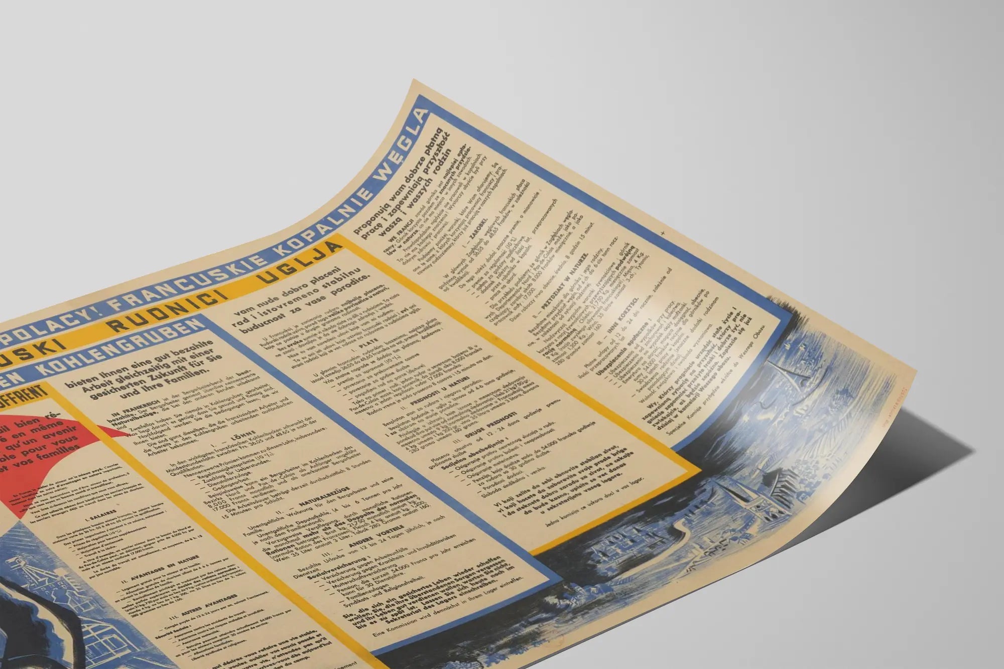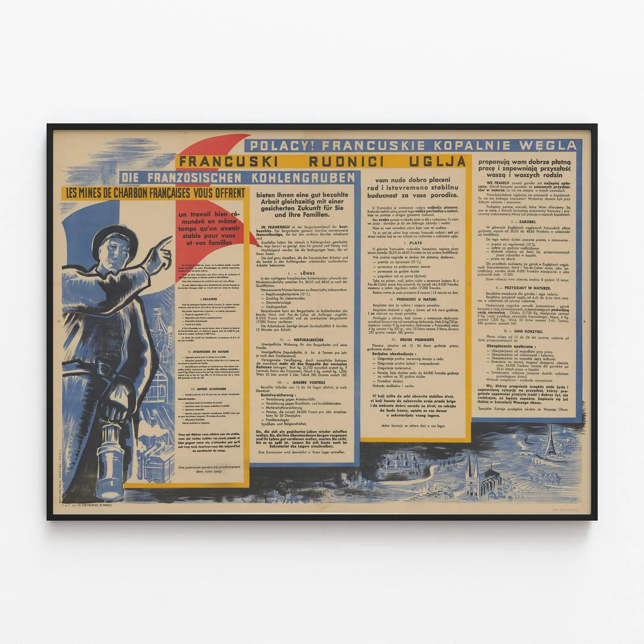 Découvrez cette affiche vintage trilingue (français, polonais, allemand) destinée à promouvoir le travail dans les mines de charbon françaises. Ce poster est un exemple marquant de la décoration murale à vocation historique et informative, idéale pour les passionnés d'histoire du travail, de l'industrie minière ou de la communication vintage. Ce tableau affiche un message clair : les mines de charbon offrent un emploi bien rémunéré et un avenir stable. Enrichie par une illustration expressive d'un mineur pointant du doigt, elle combine une palette de couleurs limitée mais efficace, principalement bleu, jaune, rouge et noir, qui attire l'œil et renforce le caractère engagé de la communication. Le fond laisse apercevoir une scène industrielle et urbaine en style gravure, donnant un contexte visuel à l'époque et au secteur. Cette affiche est un véritable objet de décoration murale qui donnera une touche rétro et authentique à tout intérieur. Elle est parfaite pour être encadrée et mise en valeur dans un bureau, une bibliothèque, une salle d’exposition ou pour des collectionneurs d'affiches historiques ou d'affiches publicitaires. Au-delà de son aspect visuel, cette affiche témoigne du contexte économique et social du secteur minier français, illustrant les incitations proposées aux travailleurs étrangers, notamment polonais et allemands, avec des détails précis sur les salaires, les avantages en nature, les assurances sociales et les conditions de travail. Ces informations traduites en trois langues rendent cette affiche aussi intéressante pour une étude comparative des politiques d'immigration et d'emploi industrielles d'époque. En somme, ce poster mural est un choix décoratif à la fois esthétique et chargé d'histoire, permettant d'apporter une touche unique et réfléchie à votre décoration intérieure. Que ce soit dans un cadre historique, industriel ou thématique, cette affiche murale vintage est un élément remarquable pour enrichir votre collection et habiller vos murs avec sens.