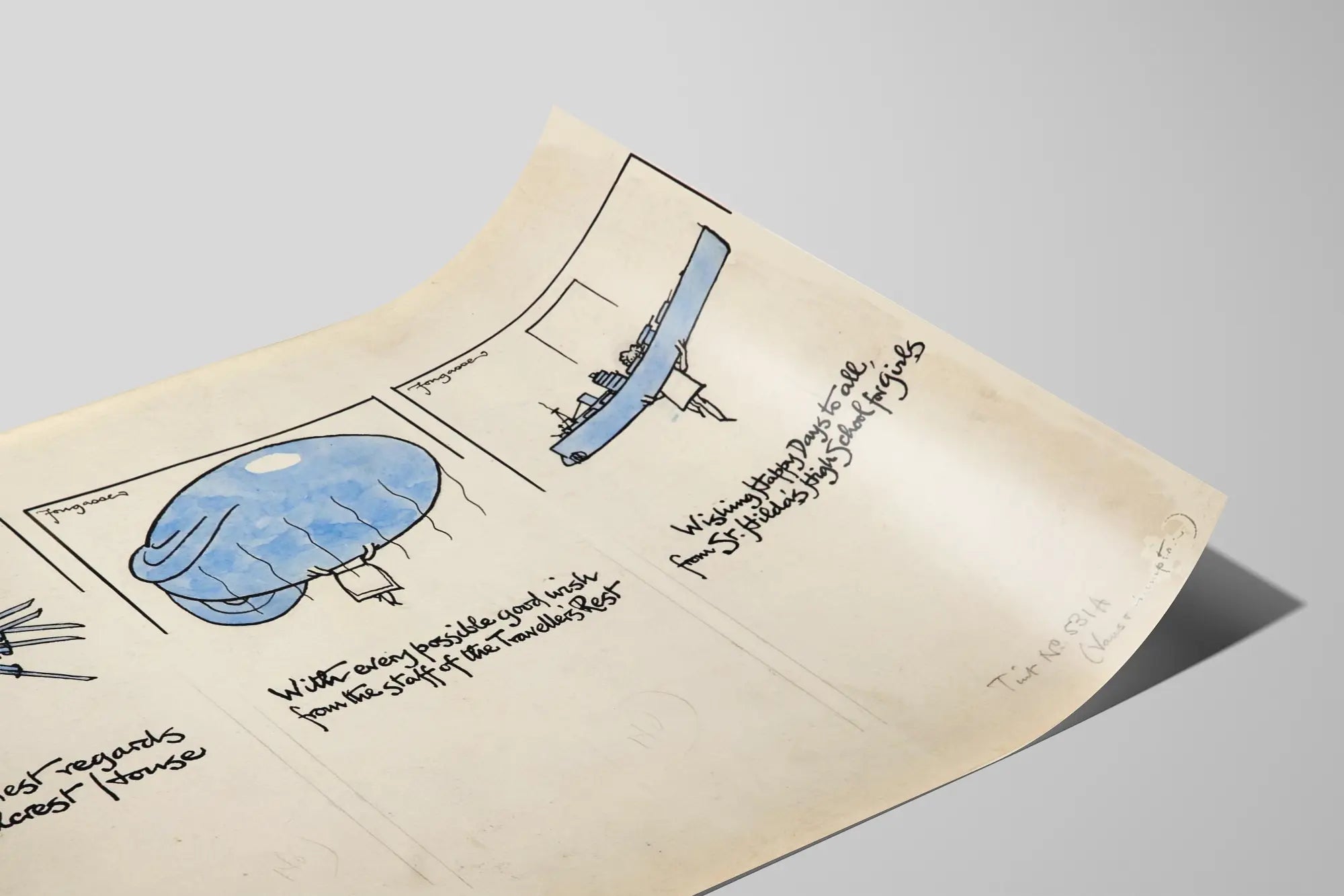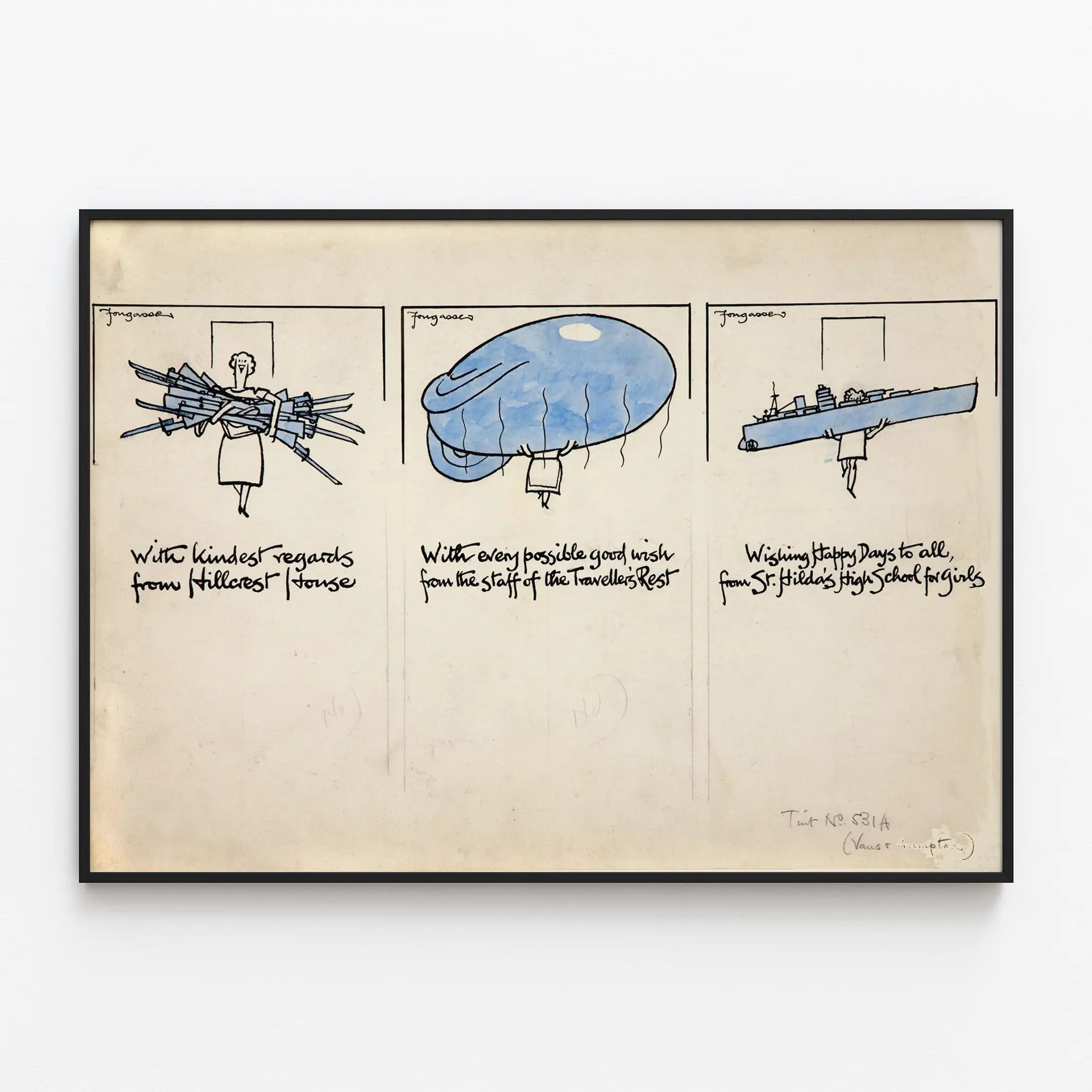 Découvrez cette affiche vintage originale illustrant trois figures féminines dessinées dans un style cartoon. Chaque personnage tient un objet symbolique : la première femme porte un groupe de fusils, la deuxième soulève un ballon bleu de grande taille, tandis que la troisième est représentée portant un grand navire de guerre. Cette décoration murale joue sur le contraste entre simplicité du dessin au trait et l’usage de la couleur uniquement sur certains éléments. Chaque vignette est accompagnée d’un texte manuscrit en anglais qui semble être des messages de vœux provenant de différentes institutions, ajoutant une touche narrative et historique à l’œuvre. Ce poster est idéal pour les amateurs de décoration murale originale, alliant humour et références iconographiques, parfait pour un intérieur au style rétro ou éclectique. Son style léger et épuré en fait aussi un choix intéressant pour un bureau ou une pièce dédiée à la créativité. L’œuvre présente une composition triptyque et une harmonie visuelle basée sur le noir et bleu, renforçant son caractère graphique et attrayant. Que ce soit pour orner un mur de salon, une bibliothèque ou un espace artistique, cette affiche unique apportera une touche d’authenticité et de personnalité à votre décoration. Vous apprécierez ce poster pour son design sobre mais évocateur, qui mêle illustration et écriture manuscrite dans une atmosphère vintage très tendance.