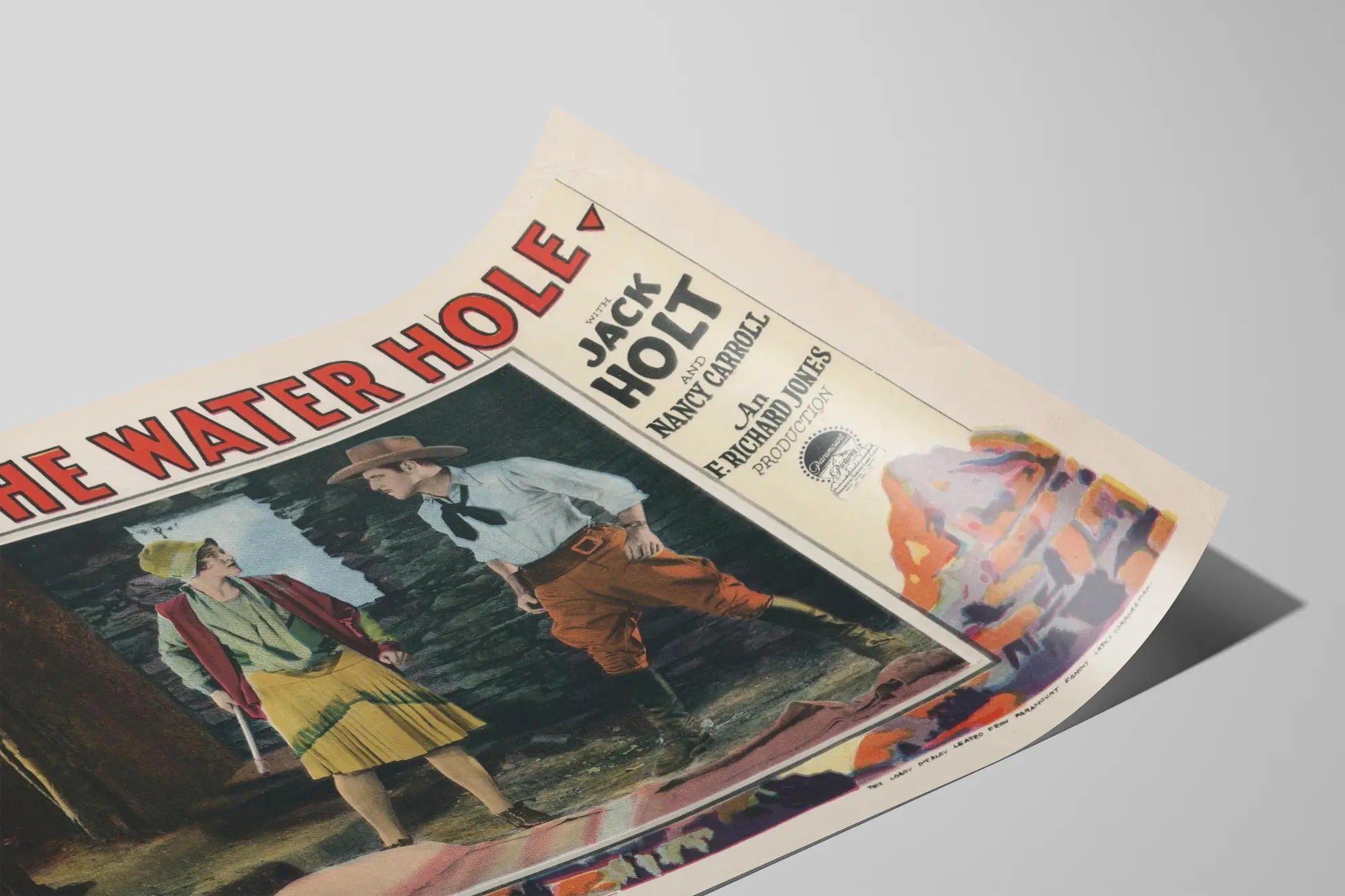 Cette affiche vintage originale illustre le film western "The Water Hole" basé sur l'œuvre de Zane Grey. Elle présente un décor de ruines en pierre où deux personnages se font face, une femme habillée d'une jupe plissée jaune et un homme en pantalon ample et bottes hautes, tous deux dans un style vestimentaire rappelant le Far West américain. La composition met en valeur les contrastes de couleurs avec des éléments forts comme les tons ocres, rouges, bleus et verts. Cette affiche de style ancien, typique des années de l'âge d'or du cinéma Paramount Pictures, constitue une superbe pièce de décoration murale. Elle s'intègre parfaitement à une décoration intérieure à thème western ou vintage, apportant une touche d'authenticité et d'histoire cinématographique. Que ce soit comme poster encadré ou tableau décoratif, elle embellira un salon, bureau ou salle de projection. Ce visuel évoque l'aventure et le romantisme des grandes plaines américaines, évoquant l'esprit de conquête et les récits d'époque. Offrez à votre intérieur un élément décoratif unique avec cette affiche western rare, hommage à Zane Grey et à l'esthétique des affiches cinématographiques classiques.