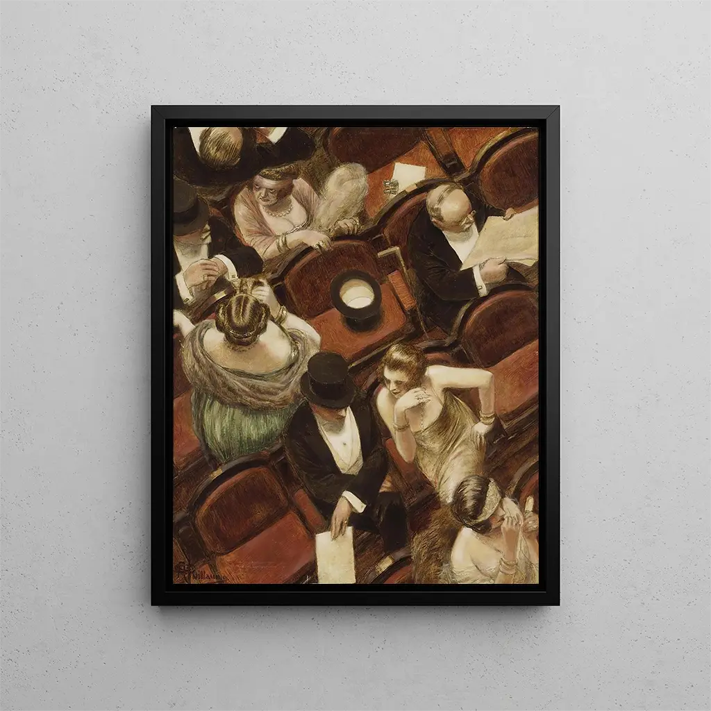 Lo stile di Albert Guillaume si distingue per il suo realismo sottile e il suo senso acuto dell’osservazione. In Au théâtre, le sfumature di luce e ombra giocano un ruolo fondamentale, creando un’atmosfera calda e avvolgente. I volti, finemente dettagliati, esprimono una gamma di emozioni che vanno dall’eccitazione alla malinconia, rivelando così la complessità delle relazioni sociali dell’epoca. La palette di colori scelta dall’artista, mescolando tonalità ricche e vivaci, accentua la ricchezza dei costumi e lo splendore degli accessori, facendo di ogni personaggio un vero attore della scena. Questo quadro è anche caratterizzato da una composizione astuta, in cui lo sguardo è guidato attraverso la scena, permettendo allo spettatore di esplorare i diversi livelli di questa rappresentazione teatrale.
