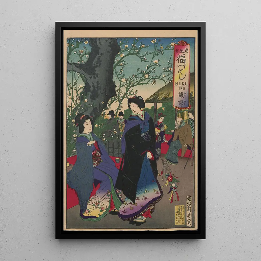 L'œuvre "L'Album de Nishikie Pl24" de Toyohara Chikanobu nous plonge dans un monde coloré et riche en détails. Questa riproduzione mette in evidenza personaggi eleganti vestiti con kimono tradizionali, che si muovono in un paesaggio intriso di serenità. I colori vivaci e i motivi delicati si mescolano armoniosamente, creando un'atmosfera al tempo stesso dinamica e rilassante. La tecnica dell'estampe su carta, tipica dell'epoca Edo, permette di catturare la luce e le texture con una precisione notevole, invitando lo spettatore a immergersi in questa scena quotidiana del Giappone antico.