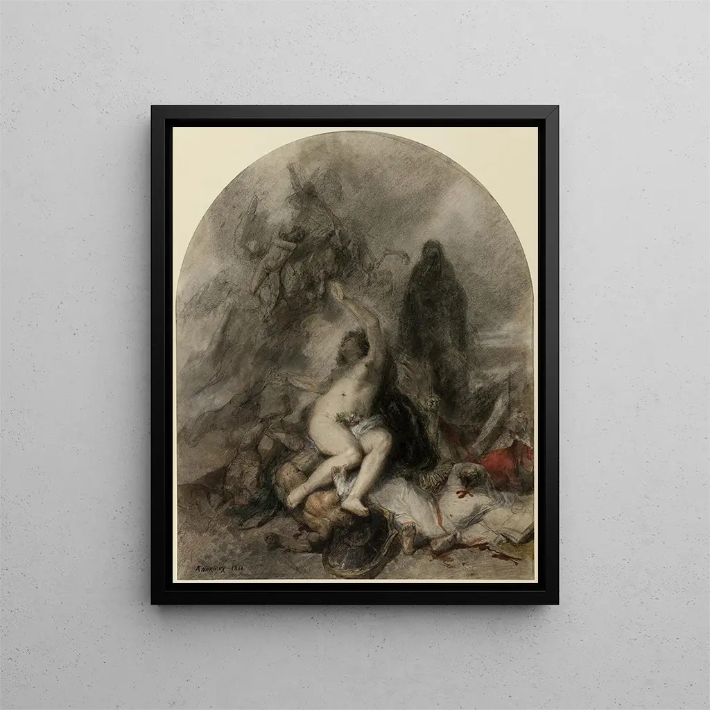 La stampa d'arte "Allégorie della guerra" di Clément-Auguste Andrieux si presenta come un quadro impressionante, una finestra aperta sui tormenti e le glorie che la guerra genera. Quest'opera, ricca di simboli ed emozioni, invita lo spettatore a una riflessione profonda sulle conseguenze della violenza e sulla natura umana. Attraverso colori vibranti e forme dinamiche, Andrieux riesce a catturare l'essenza stessa della guerra, sia distruttiva che affascinante. Contemplando questa stampa d'arte, si percepisce immediatamente una tensione palpabile, un mix di timore e ammirazione di fronte alla potenza dell'arte e all'impatto della guerra sull'anima umana.