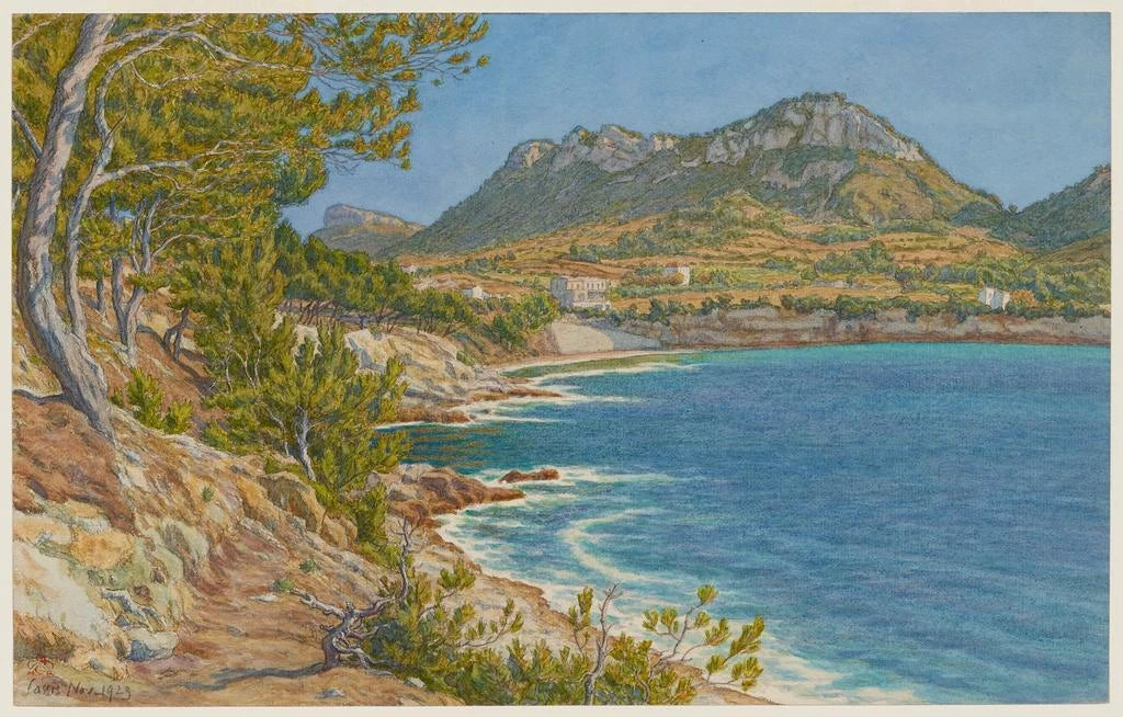 In questa opera vibrante, Henri Rivière cattura la bellezza selvaggia della costa mediterranea. Le sfumature di blu e di verde si mescolano armoniosamente, evocando i riflessi del mare sotto il sole. La tecnica dell'acquarello, con i suoi tocchi delicati, dà vita a un paesaggio dove le forme delle scogliere si delineano con eleganza. L'atmosfera è allo stesso tempo serena e dinamica, invitando lo spettatore a immergersi in questa scena naturale. Ogni colpo di pennello sembra raccontare una storia, quella di un momento sospeso nel tempo, in cui la natura si esprime nella sua piena magnificenza.