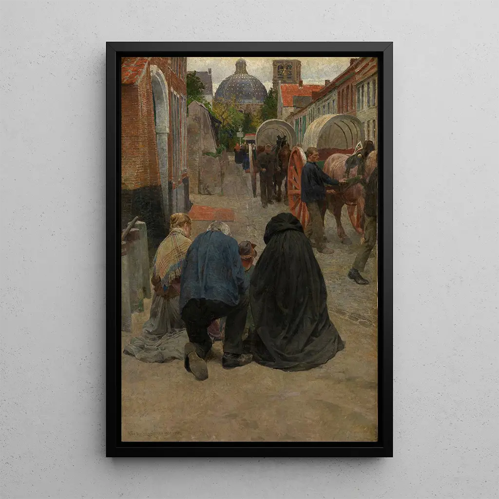 Frans Van Leemputten, attivo nel XIX secolo, è un artista belga le cui opere si concentrano su scene di vita quotidiana e eventi religiosi. Influenzato dal movimento romantico, cerca di esprimere emozioni profonde attraverso le sue composizioni. L'importanza di Van Leemputten risiede nella sua capacità di immortalare momenti semplici ma significativi, come questa processione, che riflettono i valori e le tradizioni della sua epoca. Il suo stile, allo stesso tempo accessibile e toccante, lo rende un pittore apprezzato per la sua sensibilità e il suo impegno nella rappresentazione della vita umana.
