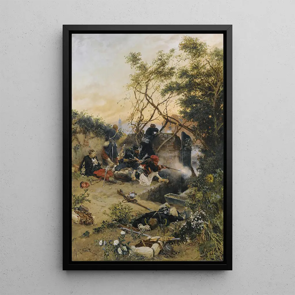 Nella riproduzione di Essuyant le feu, Alphonse Marie de Neuville dipinge una scena toccante di coraggio e resilienza. La stampa d'arte illustra soldati in piena azione, affrontando sfide estreme con un'intensità palpabile. I colori scuri e i contrasti marcati accentuano l'atmosfera drammatica dell'opera. La tecnica dell'artista, mescolando realismo ed espressività, permette di percepire la tensione e l'urgenza della situazione. Ogni dettaglio, dai volti determinati ai movimenti dinamici, contribuisce a creare una narrazione visiva coinvolgente che trasporta lo spettatore nel cuore dell'azione.