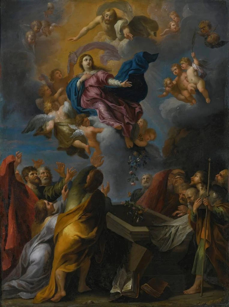 L'Assomption della Vergine si distingue per la sua composizione audace e il suo uso magistrale della luce. Le figure, scolpite e espressive, sembrano danzare in un cielo celestiale, creando un movimento fluido che attira lo sguardo verso la sommità dell'opera. Il modo in cui la luce illumina i volti degli apostoli, testimoni di questo momento sacro, rafforza l'idea di trascendenza divina. I drappeggi degli abiti, accuratamente studiati, rivelano un senso di realismo che contrasta con l’idealizzazione dei personaggi. La palette, composta da tonalità calde e dorate, evoca il calore di una luce divina, mentre le sfumature di blu e bianco simboleggiano la purezza della Vergine. Ogni dettaglio, ogni tocco di pennello, contribuisce a una narrazione visiva che trascende il semplice quadro per diventare una vera esperienza spirituale.