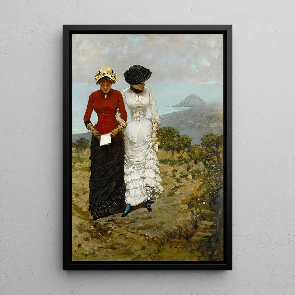 In "Approchant le rendez-vous", Ernest Giroux cattura un momento fugace, un incontro ricco di promesse. La composizione mette in evidenza una giovane donna, vestita con un abito delicato, che cammina con grazia verso un punto di incontro. I colori pastello, mescolando tonalità morbide di rosa e di blu, creano un'atmosfera romantica e sognante. La tecnica di Giroux, che unisce realismo e impressionismo, dà vita a questa scena, rendendo quasi palpabile l'emozione che ne deriva. I dettagli minuziosi dei fiori e delle foglie circostanti aggiungono un tocco di poesia, invitando lo spettatore a immergersi in questo istante sospeso.