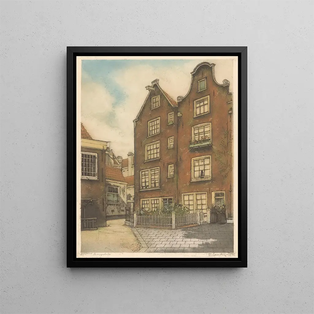L'opera di Frans Everbag si distingue per un approccio pittorico che mescola realismo e impressionismo. In "Bagijnhofje", l'artista riesce a catturare la luce di Amsterdam, quella luce così particolare che danza sui ciottoli e si riflette nelle finestre delle case antiche. Le tonalità calde e i giochi di ombra creano un'atmosfera intima, quasi palpabile. I personaggi, sebbene presenti, sembrano fondersi con lo sfondo, come se fossero testimoni silenziosi della vita che scorre. Questo quadro non si limita a rappresentare un luogo; evoca un'atmosfera, una melodia dolce che risuona nel cuore di chi lo contempla. La composizione è accuratamente orchestrata, ogni elemento è al suo posto, contribuendo all'armonia generale dell'opera.