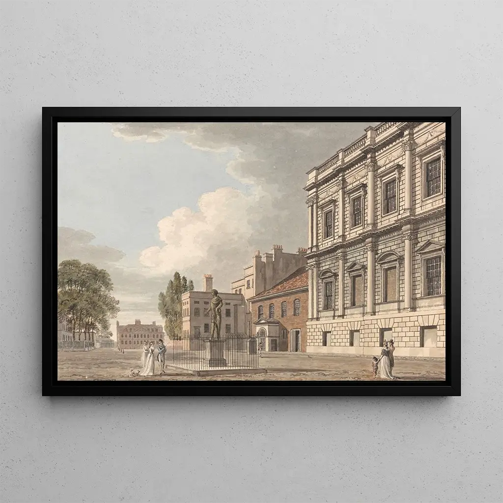 La riproduzione di Banqueting House, Whitehall, ci trasporta nel cuore dell'architettura del XVII secolo. Quest'opera emblematicamente, realizzata da Thomas Malton il Giovane, si distingue per le sue linee maestose e il raffinato uso della luce. I colori delicati e i dettagli minuziosi creano un'atmosfera allo stesso tempo solenne e accogliente. La tela evoca i fasti di un'epoca in cui arte e architettura si mescolavano per celebrare la grandezza della monarchia britannica. Ogni colpo di pennello sembra raccontare una storia, invitando lo spettatore a esplorare le sottigliezze di questo edificio storico.