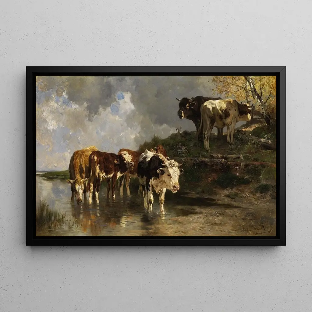 Anton Braith, peintre allemand du XIXe siècle, est reconnu pour ses œuvres qui célèbrent la beauté de la nature et la vie rurale. Influencé par le mouvement romantique, il a su capturer l'essence de la campagne à travers des compositions riches et évocatrices. Sa carrière, marquée par une attention particulière aux détails et une palette de couleurs vibrantes, a fait de lui un représentant emblématique de l'art pastoral. Ses tableaux, tels que Bétail à l'abreuvoir, témoignent de son amour pour le monde animal et végétal, tout en reflétant les préoccupations de son époque, où la nature était souvent idéalisée.