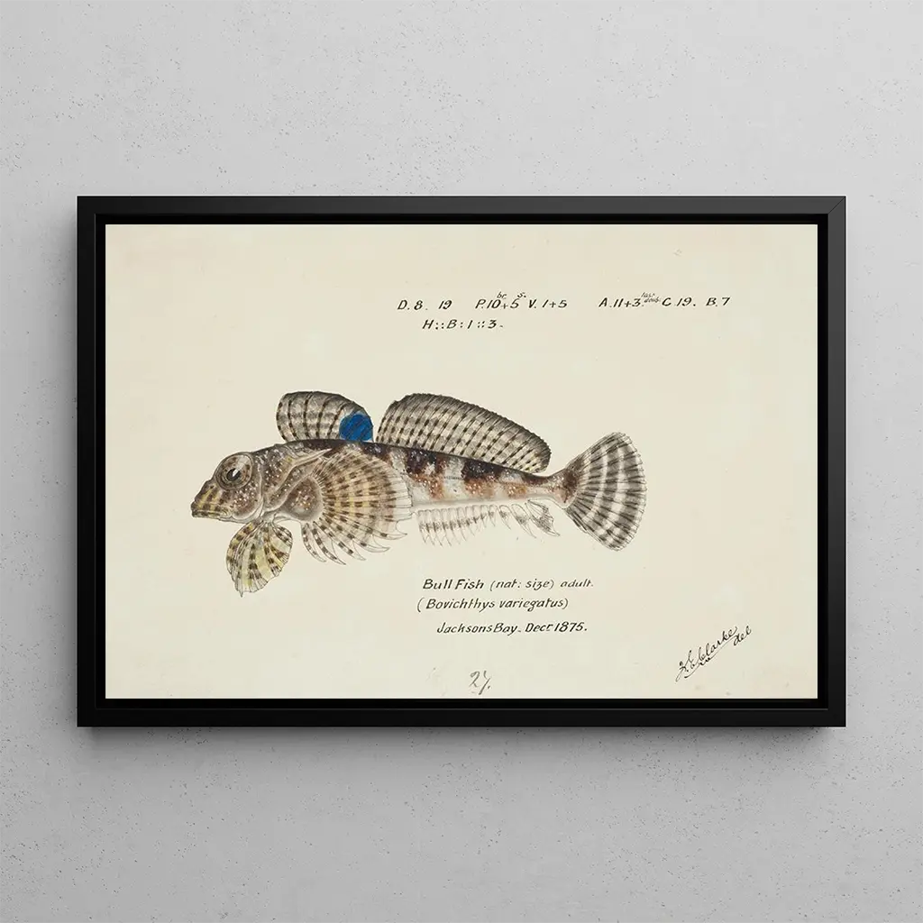 Bovichtus variegatus Pesce spinoso della Nuova Zelanda Il Bovichtus variegatus, pesce spinoso emblematico della Nuova Zelanda, è rappresentato con una precisione notevole in questa stampa d'arte. Le sfumature vibranti di blu e verde del suo corpo contrastano con le tonalità più scure del suo habitat sottomarino. La tecnica di Frank Edward Clarke, che combina realismo e dettagli minuziosi, permette di catturare la bellezza e la complessità di questo pesce unico. Ogni squama scintillante sembra quasi viva, invitando lo spettatore a immergersi in un mondo acquatico affascinante. Frank Edward Clarke: un naturalista appassionato Frank Edward Clarke, artista e naturalista del XX secolo, ha dedicato la sua carriera allo studio e alla rappresentazione della fauna marina. Il suo lavoro è caratterizzato da un approccio scientifico, ma anche da una sensibilità artistica che gli permette di catturare l'essenza dei suoi soggetti. Clarke ha viaggiato attraverso i mari del mondo, ispirandosi alla biodiversità che incontrava. Questa stampa d'arte del Bovichtus variegatus testimonia il suo impegno nel sensibilizzare il pubblico sulla bellezza e sulla fragilità degli ecosistemi marini. Una decorazione versatile e ricca di fascino Questa stampa d'arte del Bovichtus variegatus è un pezzo decorativo che saprà arricchire il vostro interno, sia in una sala giochi, uno studio o una camera da letto. La qualità di stampa e l'attenzione ai dettagli rendono questa tela un'aggiunta affascinante alla vostra collezione. L'attrattiva estetica di quest'opera evoca le meraviglie dell'oceano, portando un tocco di esotismo e serenità nel vostro spazio. Regalatevi un pezzo di bellezza marina che non mancherà di suscitare conversazioni e di ispirare ammirazione.