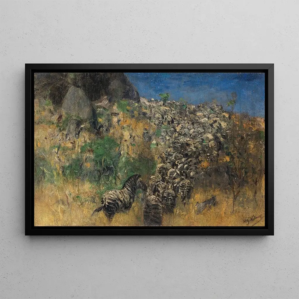 Troupeau de zèbres en fuite : une danse sauvage dans la savane Dans cette stampa d'arte de l'œuvre "Troupeau de zèbres en fuite", Wilhelm Kuhnert capture l'essence même de la vie sauvage. Les zèbres, en pleine course, sont représentés avec une dynamique saisissante, leurs rayures noires et blanches créant un contraste frappant avec le paysage doré de la savane. La technique de l'artiste, qui mêle réalisme et impressionnisme, donne une atmosphère vibrante à la scène, invitant le spectateur à ressentir l'urgence et la liberté de ces animaux majestueux. Les nuances de couleurs, allant des bruns chauds aux verts doux, ajoutent à la profondeur de l'œuvre, faisant de cette toile un véritable appel à l'évasion. Wilhelm Kuhnert : un maître de la faune sauvage Wilhelm Kuhnert, né en 1865, est un peintre allemand reconnu pour ses œuvres dédiées à la faune. Influencé par ses voyages en Afrique, il a su retranscrire avec précision la beauté des animaux dans leur habitat naturel. Son style, ancré dans le réalisme, se distingue par une attention minutieuse aux détails et une compréhension profonde des comportements animaliers. Kuhnert a été un pionnier dans la représentation de la vie sauvage, et son travail a eu un impact significatif sur l'art animalier au début du XXe siècle. Ses œuvres continuent d'inspirer les artistes contemporains et les amateurs d'art, témoignant de l'importance de son héritage. Une acquisition décorative aux multiples atouts La stampa d'arte du "Troupeau de zèbres en fuite" est une pièce décorative qui s'intègre parfaitement dans divers espaces, que ce soit un salon, un bureau ou une chambre. Sa qualité d'impression garantit une fidélité aux couleurs et aux détails de l'œuvre originale, offrant ainsi un attrait esthétique indéniable. En choisissant ce tableau, vous ajoutez une touche d'élégance et de nature à votre intérieur, tout en suscitant des conversations autour de la beauté de la faune. Cette toile est non seulement un élément décoratif, mais aussi une invitation à explorer la majesté du monde animal.