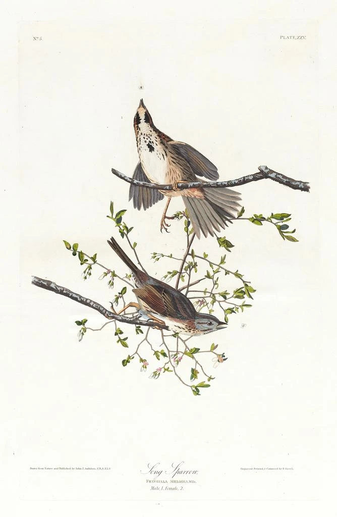 Le tableau "Bruant chanteur" de John James Audubon est une représentation saisissante de cet oiseau mélodieux, capturant l'instant où il se prépare à chanter. Avec des couleurs chaudes et des détails minutieux, cette œuvre évoque la joie et la vitalité de la nature. Les nuances de brun et de jaune se mêlent avec élégance, tandis que le fond délicat met en valeur la beauté de l'oiseau. Audubon, en véritable maître de l'observation, réussit à transmettre l'énergie et l'essence de cet oiseau, invitant le spectateur à se plonger dans un monde où la musique de la nature résonne.