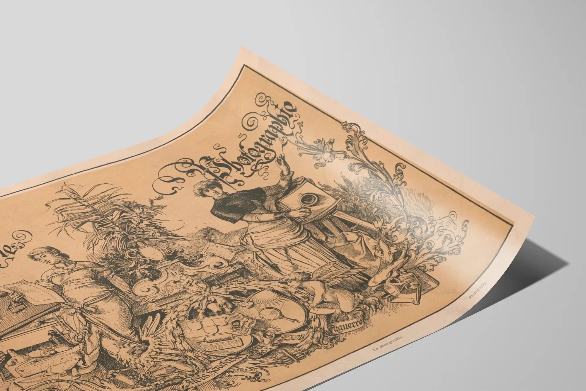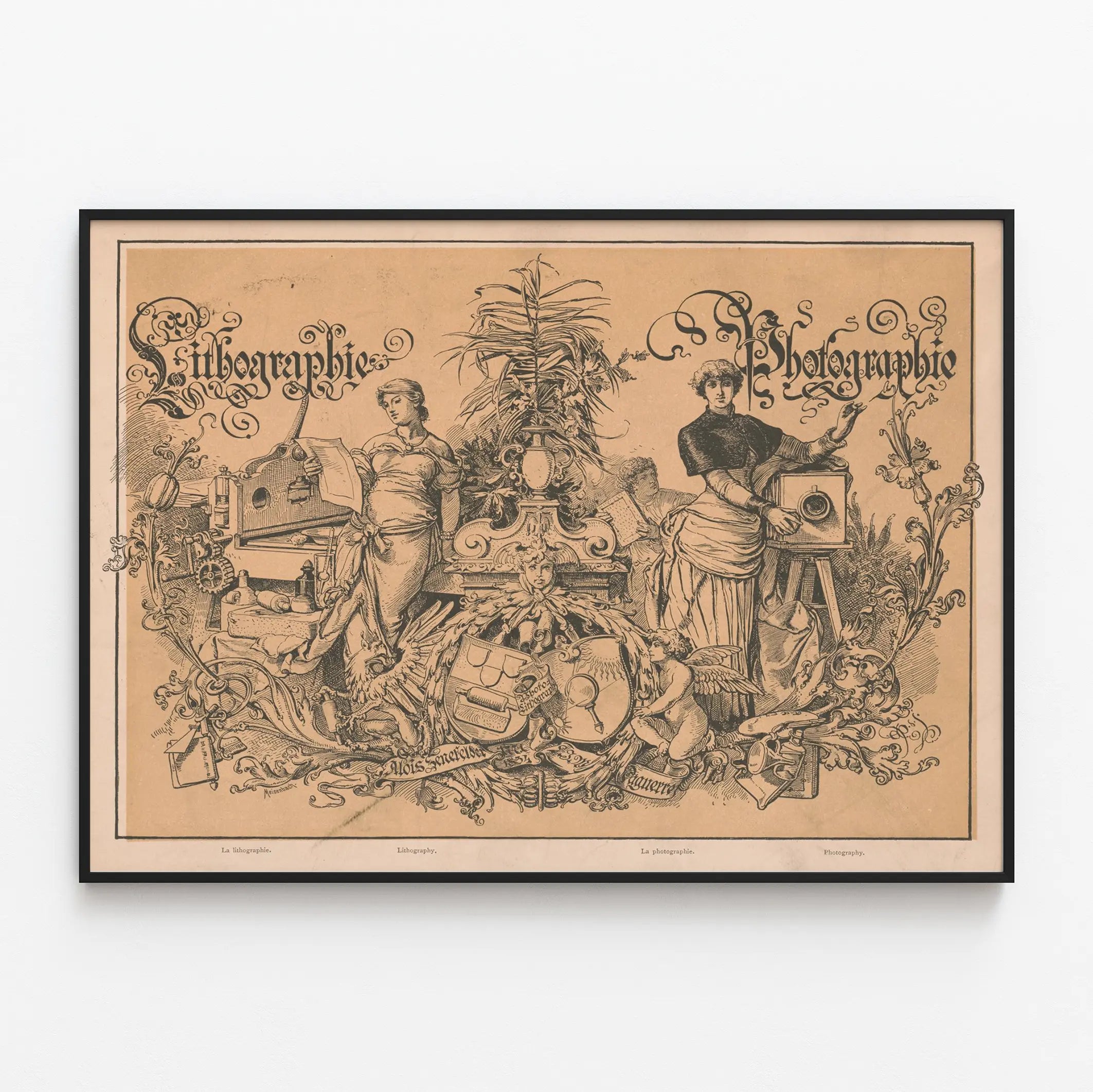 Questa stampa d'arte artistica vintage, splendidamente dettagliata, rappresenta due temi fondamentali dell'arte visiva: la litografia e la fotografia. Perfettamente concepita per gli appassionati di decorazione murale, questa antica illustrazione presenta una composizione ricca e raffinata, in cui due figure femminili incarnano ciascuna le tecniche artistiche. La donna a sinistra, che tiene una foglia e circondata da apparecchi e elementi simbolici della litografia, contrasta con quella a destra, che posa accanto a un vecchio apparecchio fotografico. Tra le due, una vegetazione rigogliosa e motivi ornamentali finemente disegnati aggiungono un tocco di eleganza alla composizione. Le iscrizioni calligrafiche «Litografia» e «Fotografia» rafforzano l'estetica vintage e artistica di questa stampa d'arte. Questo pezzo è ideale per conferire un'atmosfera sia storica che estetica al vostro interno, che si tratti di un soggiorno, di uno studio o di uno spazio dedicato alla creatività. Disponibile come stampa o poster, si integra facilmente in una cornice classica o moderna. Questa decorazione murale simboleggia l'evoluzione delle tecniche artistiche e offre un tocco raffinato alle pareti, invitando alla riflessione sull'arte della riproduzione delle immagini. Regalate un tocco culturale e grafico al vostro spazio con questa rappresentazione delicata ed evocativa dell'unione tra litografia e fotografia.