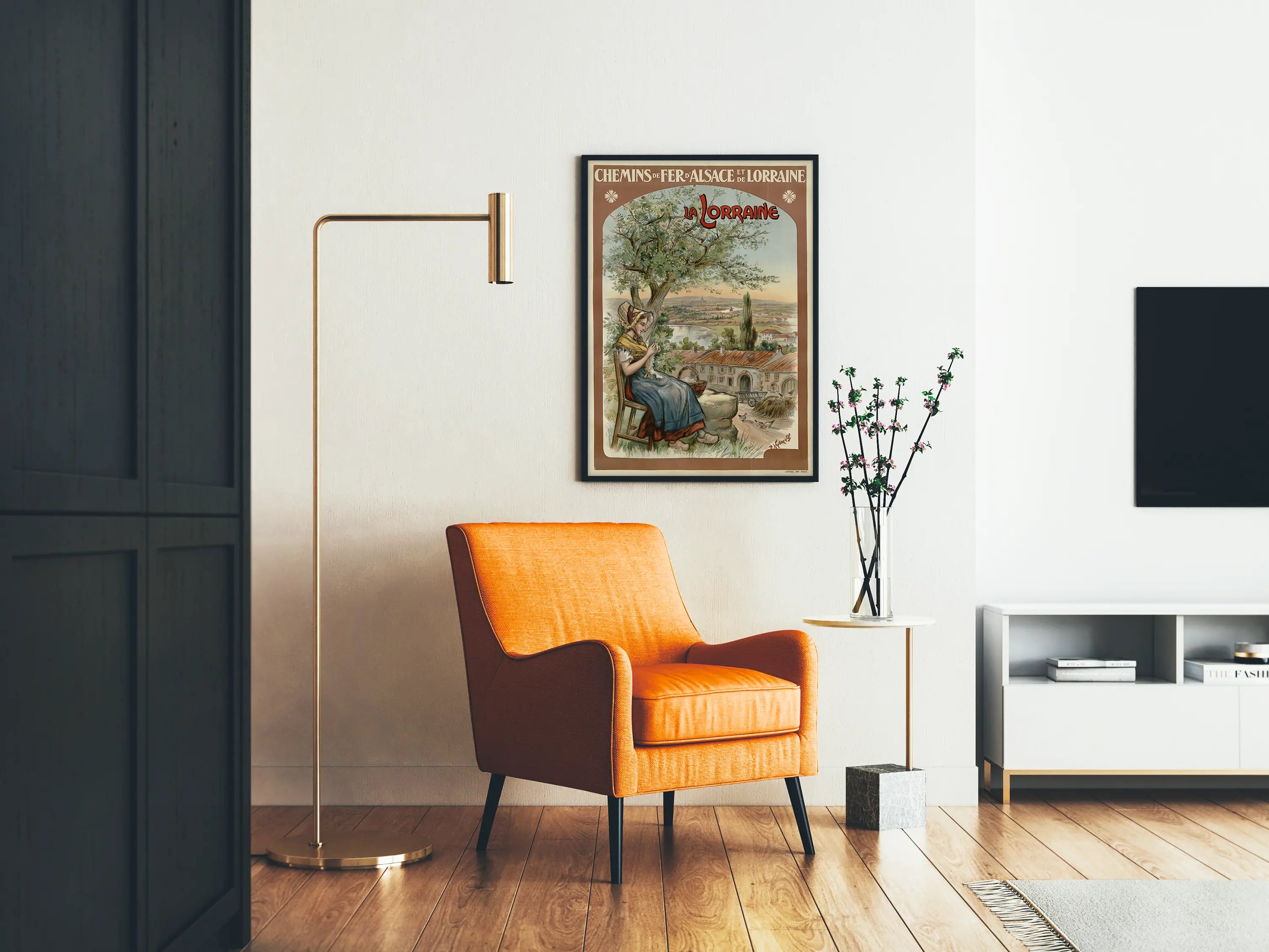 Scoprite questa locandina vintage dedicata alle Ferrovie dell'Alsazia e della Lorena, che mette in risalto la regione della Lorena. Questo poster decorativo da parete raffigura una scena campestre tranquilla, dove una donna in costume tradizionale è seduta sotto un albero, impegnata a cucire. L'ambiente rurale è splendidamente rappresentato con una fattoria tipica, animali da cortile come galline e elementi agricoli quali una carriola e fascine di fieno. Sullo sfondo si estende un paesaggio con un corso d'acqua tortuoso e una città lontana dominata da un'architettura tradizionale con tetti rossi. La palette di colori delicati e naturali, tra tonalità terrose e verdi folti, conferisce a questa scena un'atmosfera calda e autentica. Questa locandina rappresenta un esempio perfetto di arte pubblicitaria d'epoca, unendo fascino regionale e nostalgia, ideale come decorazione murale che valorizza il patrimonio francese. Che si tratti di un interno in stile vintage, rustico o campagnolo, questo poster da parete aggiungerà un tocco di eleganza e storia. La sua composizione equilibrata e i dettagli curati ne fanno sia un elemento decorativo che un oggetto da collezione ambito. Regalate ai vostri muri un invito a viaggiare nel tempo attraverso il fascino delle ferrovie dell'Alsazia e della Lorena, lasciandovi trasportare dalla dolcezza di vivere evocata da questa illustrazione tradizionale.