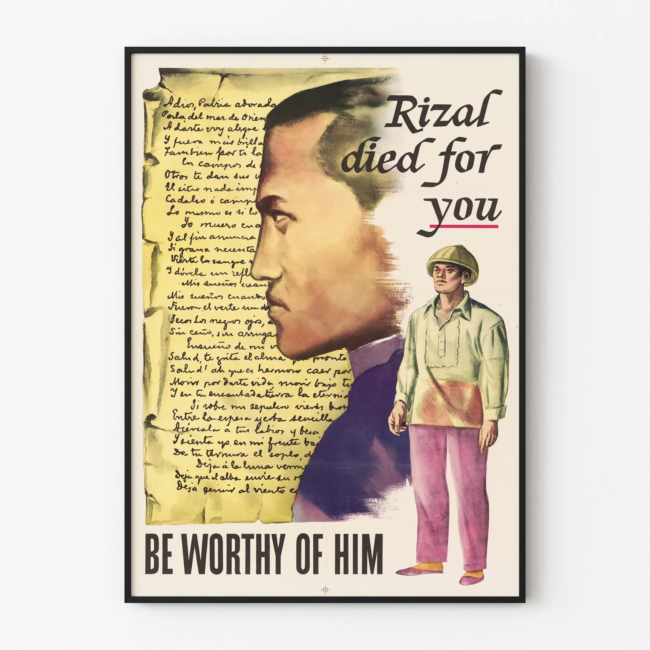 Questa potente e suggestiva stampa murale mette in evidenza la figura di José Rizal, eroe filippino, con un doppio ritratto: un profilo maestoso accompagnato da un personaggio in abiti tradizionali. La composizione artistica combina un'illustrazione realistica e uno sfondo parzialmente manoscritto, conferendo alla stampa uno stile vintage e autentico. Il testo "Rizal died for you, be worthy of him" è un forte invito all'impegno e al riconoscimento, rafforzando il messaggio ispiratore di questa decorazione murale. Questa stampa si integra perfettamente in diversi spazi, che si tratti di uffici, sale studio o luoghi di vocazione culturale, aggiungendo un tocco storico e impegnato all'atmosfera. La scelta di colori delicati mescolati a tocchi più scuri crea un contrasto armonioso, mettendo in risalto il personaggio centrale e lasciando spazio alla calligrafia dello sfondo che evoca una lettera manoscritta antica. Questo oggetto decorativo è ideale per gli appassionati di storia, di cultura filippina o per chi desidera arredare la propria casa con un pezzo carico di significato ed emozione. In sintesi, questa stampa combina estetica e messaggio impegnato, rendendo questa opera un elemento decorativo murale unico e memorabile che stimola riflessione e ispirazione.