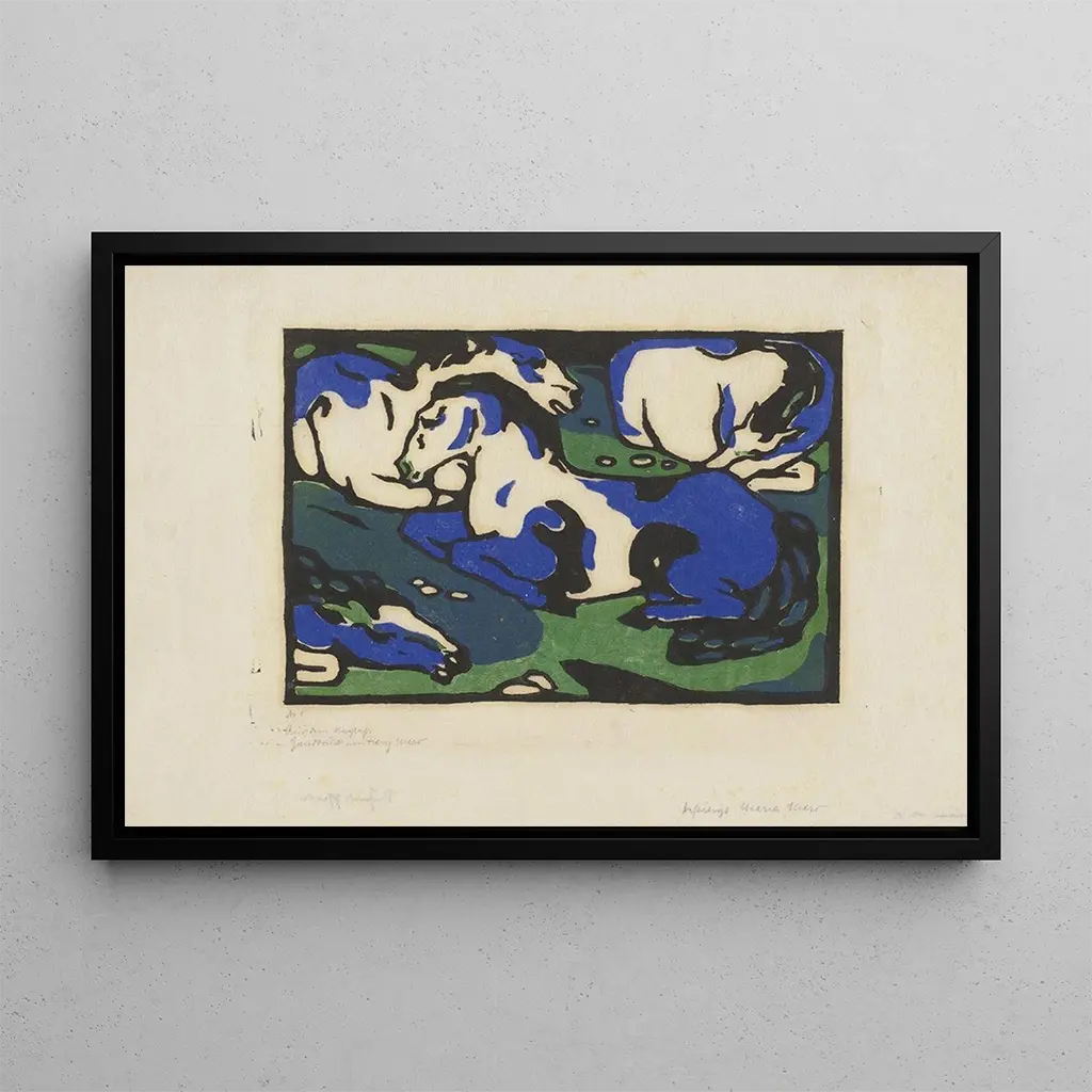 Chevaux al Riposo: un'ode alla bellezza animale "Chevaux al Riposo", opera emblematica di Franz Marc, cattura l'essenza stessa dell'armonia tra animale e natura. I cavalli, rappresentati in tonalità vibranti di blu, giallo e rosso, sembrano sbocciare in un paesaggio onirico. La tecnica di Marc, caratterizzata da forme stilizzate e colori audaci, crea un'atmosfera allo stesso tempo dinamica e serena. Questa tela evoca un momento di tranquillità, in cui i cavalli, simboli di forza e libertà, si riposano pacificamente, offrendo allo spettatore una visione rasserenante e contemplativa. Franz Marc: pioniere del Fauvismo e dell'Espressionismo Franz Marc, figura di rilievo all'inizio del XX secolo, è uno dei fondatori del movimento espressionista in Germania. Influenzato dal fauvismo e dalle filosofie spirituali del suo tempo, sviluppa uno stile unico che mette in evidenza il colore e la forma per esprimere emozioni profonde. La sua passione per gli animali, che considera simboli di purezza, si riflette nelle sue opere. "Chevaux al Riposo" è una testimonianza del suo impegno verso la rappresentazione della natura e degli animali, rivelando anche il suo desiderio di trascendere la realtà attraverso l'arte. Un'acquisizione decorativa con molteplici vantaggi La riproduzione di "Chevaux al Riposo" è una scelta ideale per chi desidera aggiungere un tocco artistico al proprio interno. Che sia in un soggiorno, in uno studio o in una camera da letto, questa stampa d'arte cattura l'occhio e suscita ammirazione. La qualità della riproduzione garantisce fedeltà ai colori vivaci e alle forme dinamiche dell'opera originale, arricchendo così il vostro spazio abitativo. Con il suo fascino estetico e la sua profondità simbolica, questa tela diventa un vero punto di conversazione, trasformando la vostra decorazione in una celebrazione della bellezza animale e dell'arte.