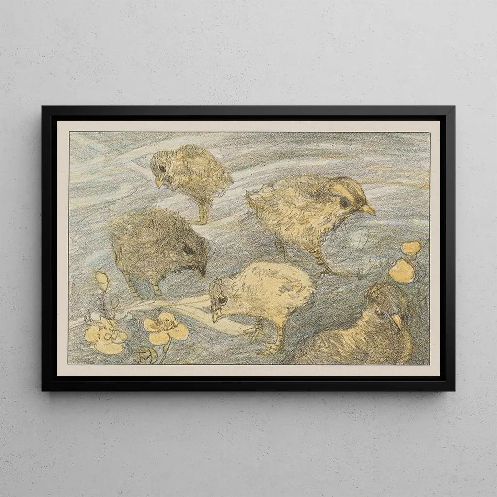 Cinq pulcini: una tenerezza aviaria da scoprire In questa delicata opera, Theo van Hoytema cattura l'innocenza e la curiosità dei giovani pulcini. La composizione, sottilmente equilibrata, mette in risalto le piccole creature con piume soffici, immerse in una luce dolce e calda. Le tonalità pastello, che vanno dal giallo pallido al beige, creano un'atmosfera rilassante, quasi onirica. La tecnica dell'acquarello, usata con finezza, permette di rendere le texture delicate delle piume e della terra, infondendo vita vibrante a questi piccoli esseri. Questa stampa d'arte di "Cinq poussins" invita a una contemplazione serena, evocando la bellezza semplice della natura. Theo van Hoytema: un pioniere dell'arte animalier Theo van Hoytema, nato nel 1863 nei Paesi Bassi, è riconosciuto per il suo approccio unico all'arte animalier, mescolando realismo e impressionismo. Influenzato dai grandi maestri della sua epoca, sviluppa uno stile che mette in evidenza la bellezza degli animali nel loro ambiente naturale. Attivo principalmente alla fine del XIX secolo e all'inizio del XX secolo, si distingue per la sua capacità di catturare l'essenza dei soggetti che dipinge. La sua opera si colloca all'incrocio tra l'arte tradizionale e le nuove tendenze artistiche, rendendolo una figura importante nel panorama artistico olandese. Un acquisto decorativo con molteplici vantaggi La riproduzione di "Cinq poussins" di Theo van Hoytema costituisce una scelta decorativa ideale per diversi spazi abitativi. Che si tratti di un soggiorno, di una cameretta o anche di un ufficio, questa tela porta un tocco di dolcezza e serenità. La qualità di stampa garantisce fedeltà ai colori e ai dettagli dell'opera originale, offrendo allo stesso tempo un'attrattiva estetica indiscutibile. Integrando questa riproduzione nella vostra decorazione, invitate non solo la natura nel vostro interno, ma create anche un punto focale che suscita curiosità e meraviglia.