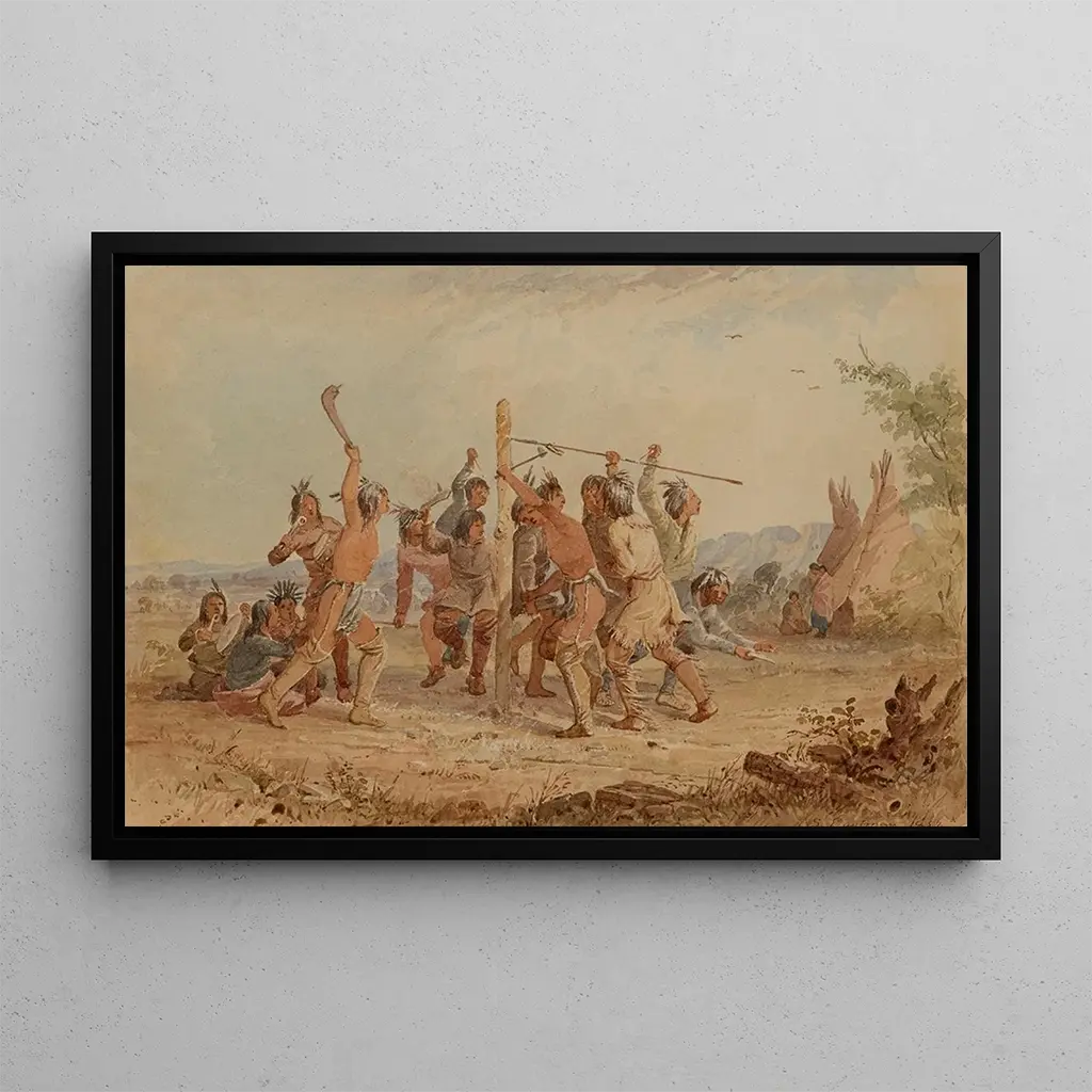 Frapper le poteau : un instant figé dans l’action L'œuvre "Frapper le poteau" de Seth Eastman capture un moment dynamique où la force et la détermination se rencontrent. Les couleurs terreuses et les nuances de bleu évoquent une atmosphère à la fois réaliste et vibrante. La technique de l'artiste, qui mêle habilement l'aquarelle et l'huile, donne vie à la scène, permettant au spectateur de ressentir l'énergie qui émane des personnages. Chaque détail, des expressions faciales aux mouvements des corps, est soigneusement rendu, créant une immersion totale dans cet instant de l'histoire. Seth Eastman : un témoin de l'Amérique du XIXe siècle Seth Eastman, né en 1808, est un artiste américain reconnu pour ses représentations de la vie et des paysages des peuples autochtones. Actif durant une période où l'expansion vers l'ouest redéfinissait le paysage culturel américain, Eastman a été influencé par ses voyages et ses interactions avec les tribus indiennes. Son style, ancré dans le réalisme, témoigne d'une volonté de documenter la vie quotidienne et les traditions des peuples qu'il a rencontrés. Son œuvre "Frapper le poteau" s'inscrit dans cette démarche, offrant un aperçu précieux de l'époque et des cultures qu'il a cherché à représenter. Une acquisition décorative aux multiples atouts Opter pour la reproduction de "Frapper le poteau" enrichit votre intérieur d'une touche d'histoire et d'authenticité. Ce tableau, idéal pour un salon ou un bureau, attire le regard et suscite des conversations. Sa qualité d'impression garantit une fidélité aux détails de l'œuvre originale, tout en offrant une esthétique raffinée qui s'harmonise avec divers styles de décoration. Que ce soit pour un amateur d'art ou un passionné d'histoire, cette toile saura apporter une dimension unique à votre espace.